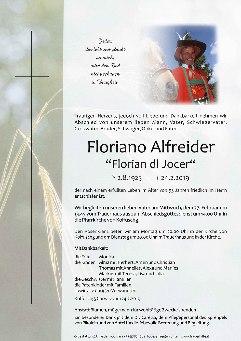 Wir begleiten unseren lieben Vater am Mittwoch, dem 27. Februar um 13.45 vom Trauerhaus aus zum Abschiedsgottesdienst um 14.00 Uhr in die Pfarrkirche von Kolfuschg.