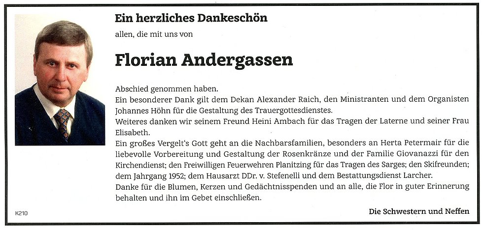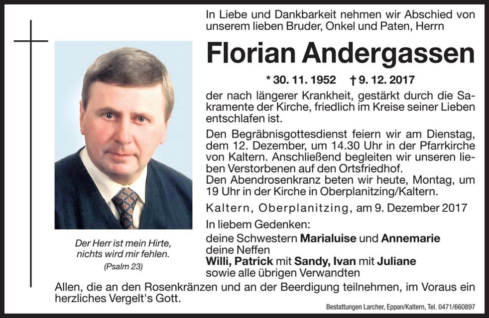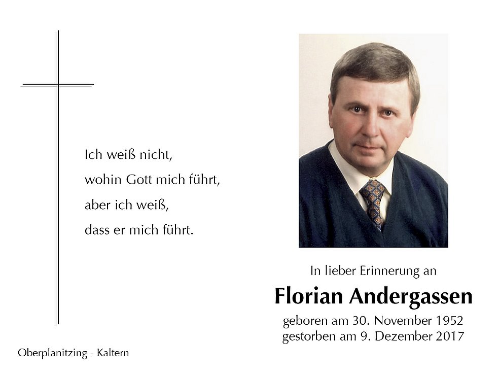 Den Begräbnisgottesdienst feiern wir am Dienstag, dem 12. Dezember um 14.30 Uhr in der Pfarrkirche von Kaltern. Anschließend begleiten wir unseren lieben Verstorbenen auf den Ortsfriedhof.