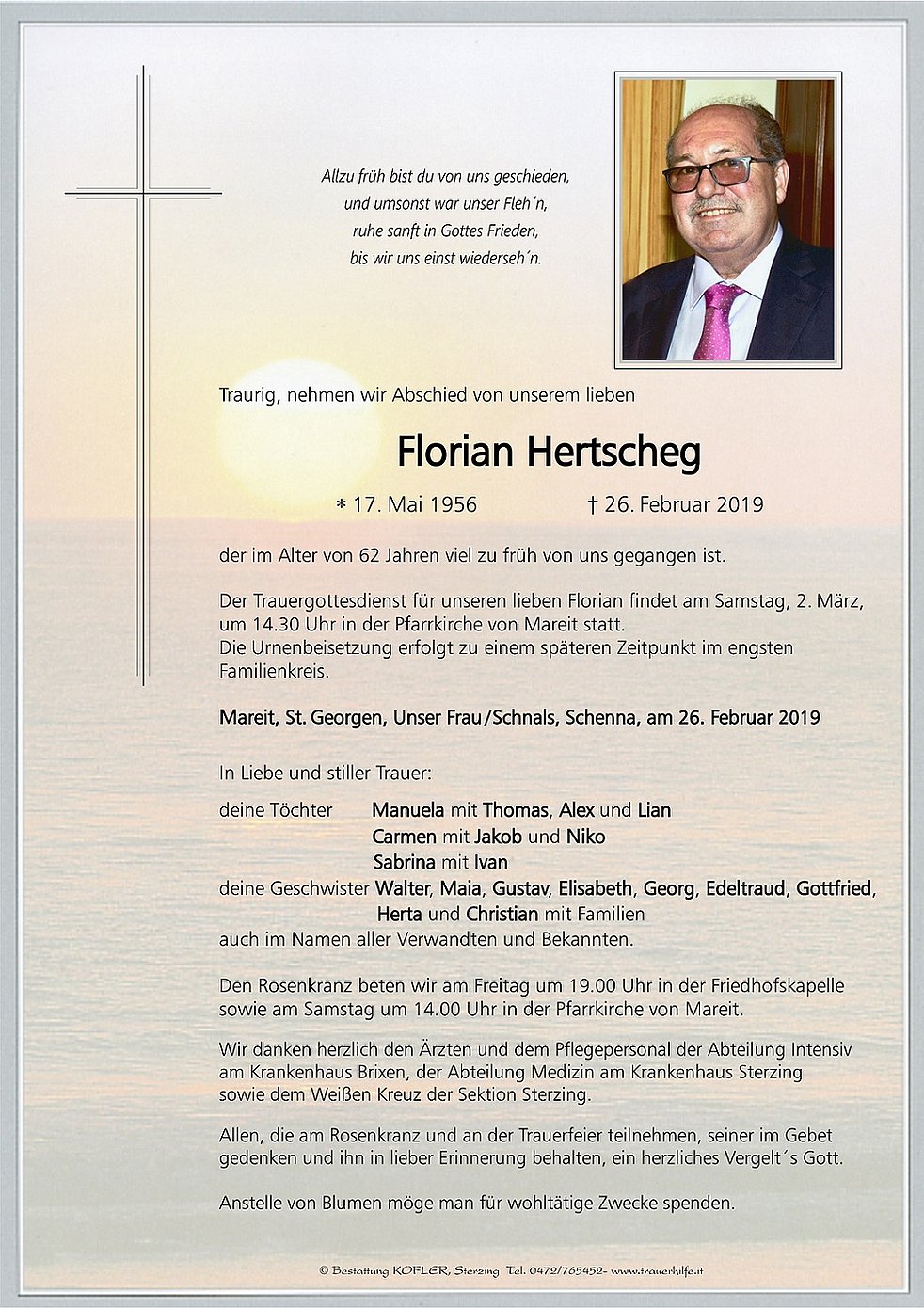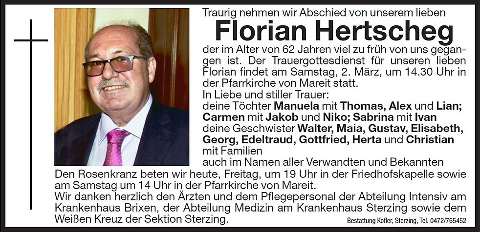 Der Trauergottesdienst für unseren lieben Florian findet am Samstag, 2. März, um 14.30 Uhr in der Pfarrkirche von Mareit statt. Die Urnenbeisetzung erfolgt zu einem späteren Zeitpunkt im engsten Familienkreis.