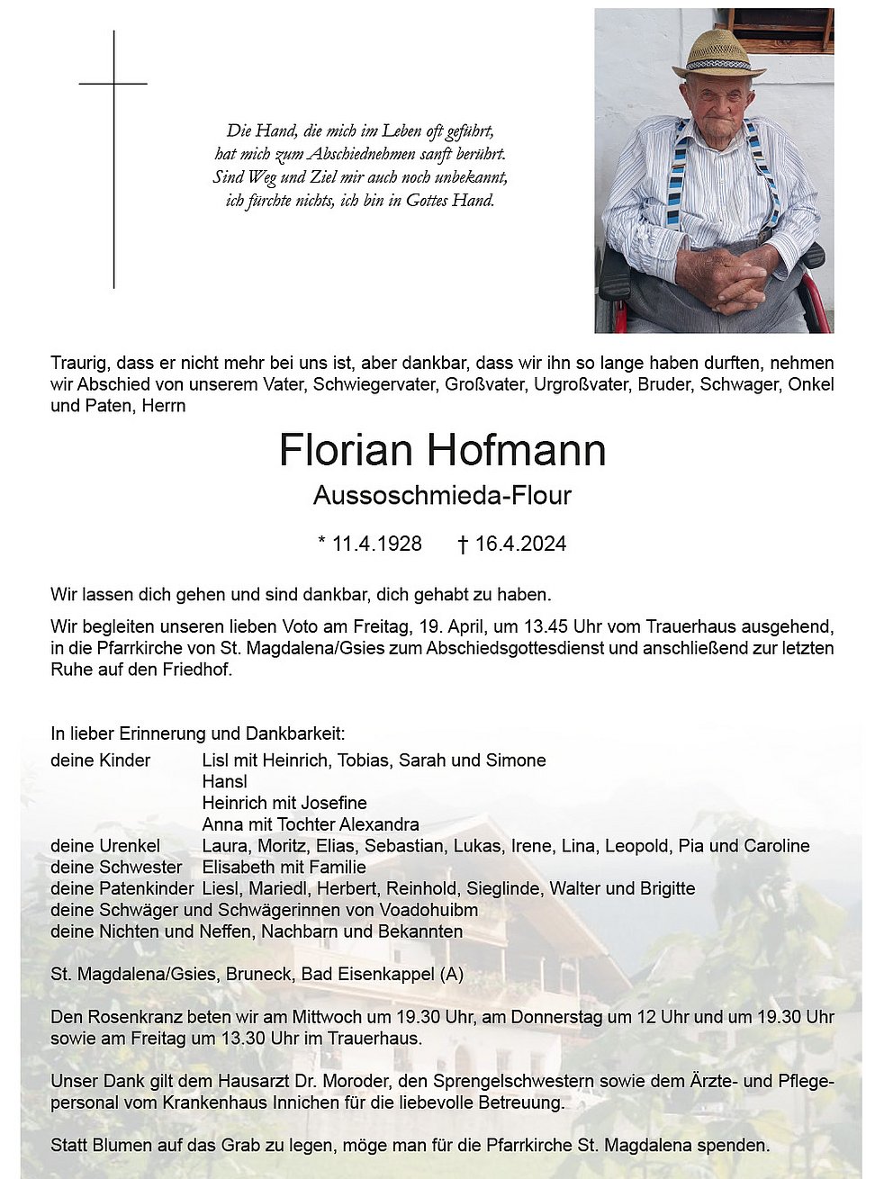 Wir möchten Dir Lisl und allen zu Ausserschmieda unser aufrichtiges Mitgefühl und unsere Anteilnahme Eures Vaters Florian übermitteln