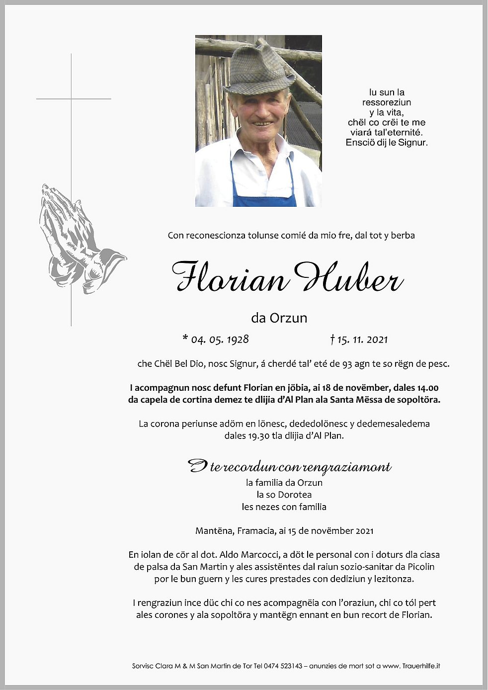 Einen herzlichen Dank, dem Hausarzt Dr. Aldo Marcocci, dem gesamten Pflegepersonal mit den Ärzten des Seniorenheimes von St. Martin in Thurn, sowie den Assistentinnen des Sprengels Pikolein für die liebevolle, fürsorgliche Pflege und Betreuung.
