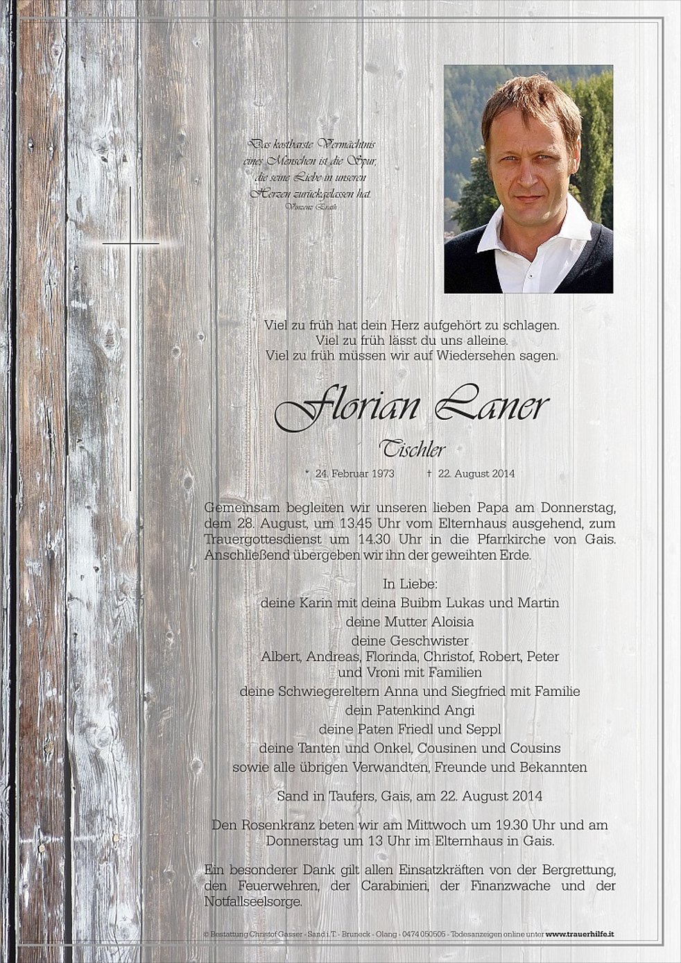 Gemeinsam begleiten wir unseren lieben Papa am Donnerstag, dem 28. August, um 13.45 Uhr vom Elternhaus ausgehend, zum Trauergottesdienst um 14.30 Uhr in die Pfarrkirche von Gais. Anschließend übergeben wir ihn der geweihten Erde.