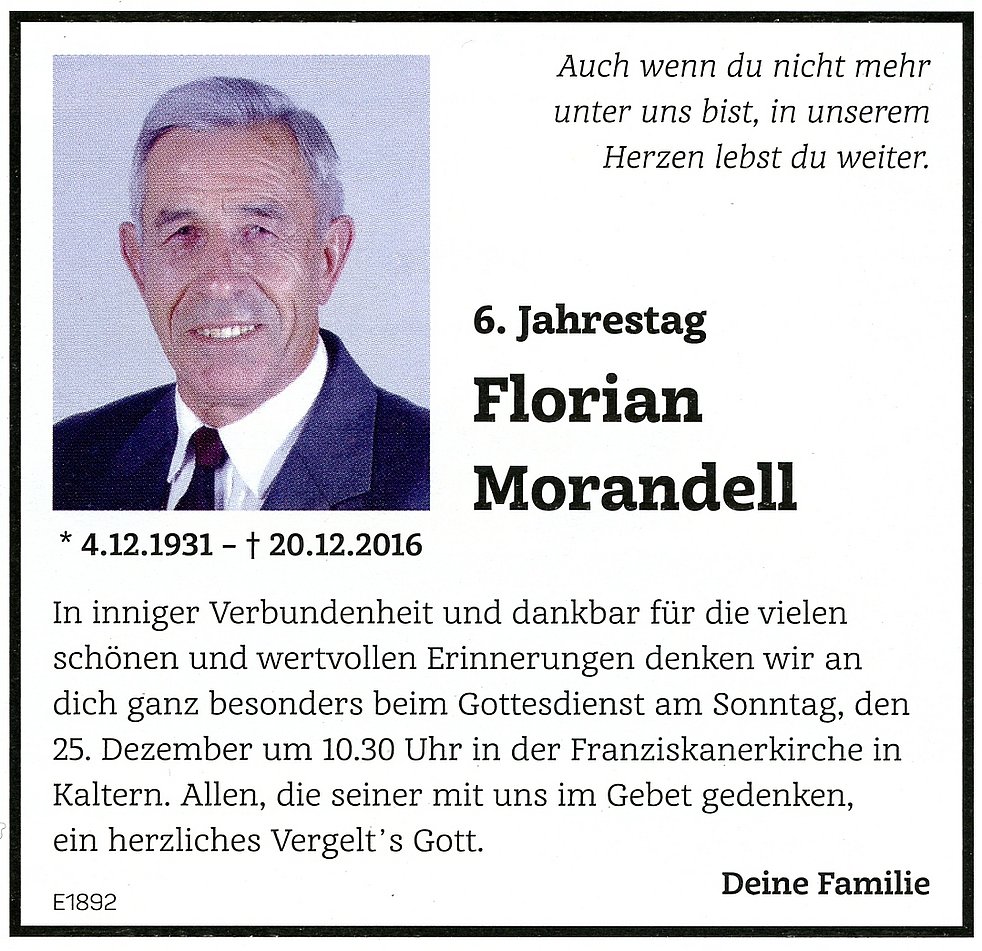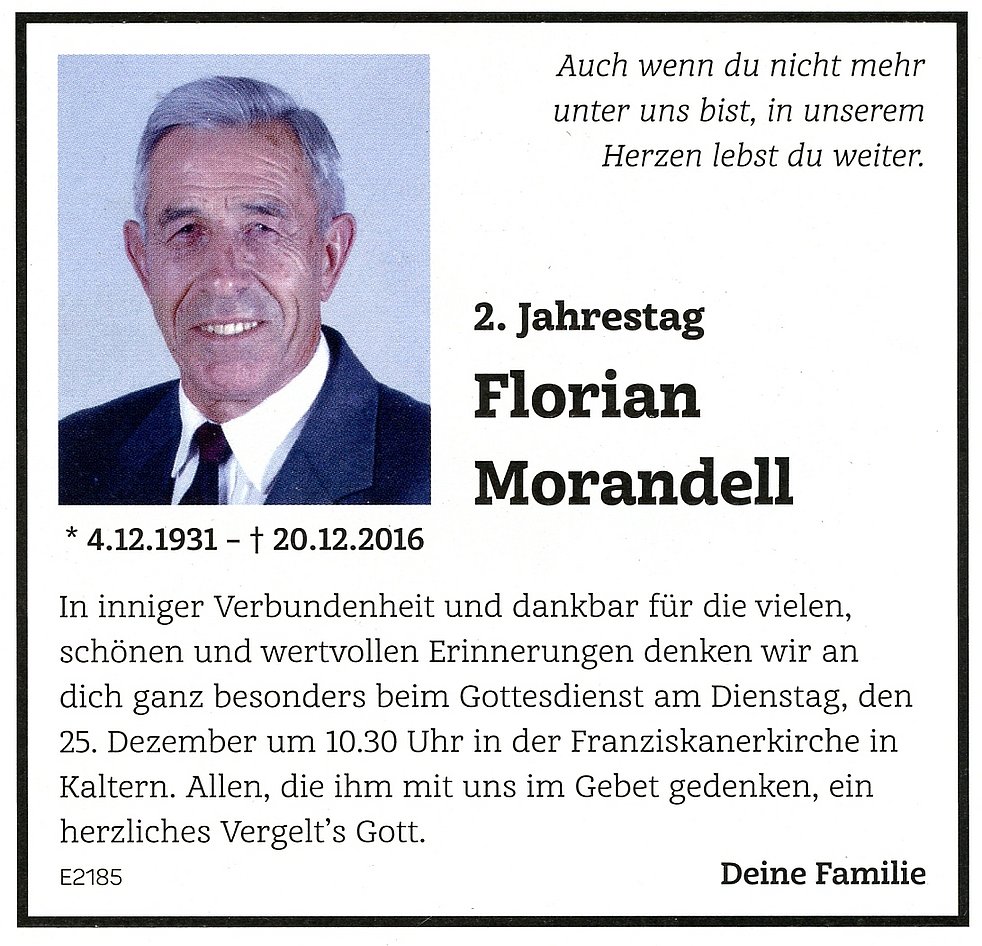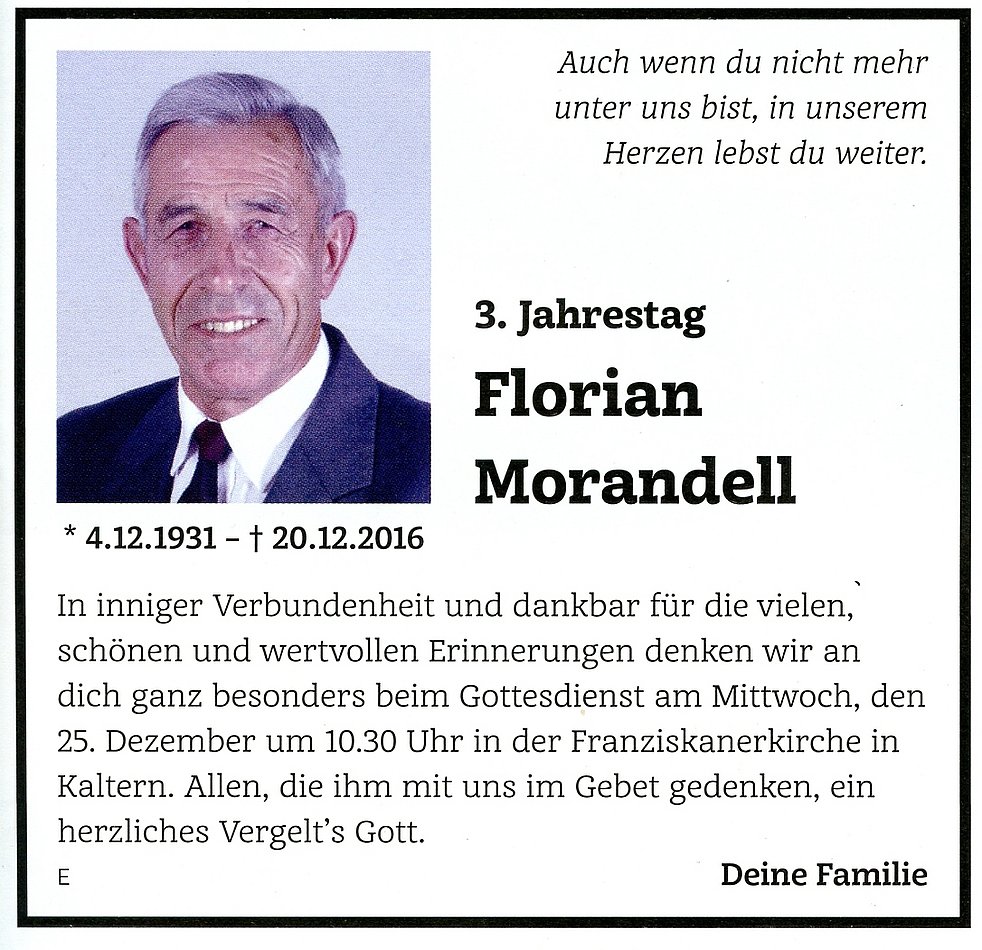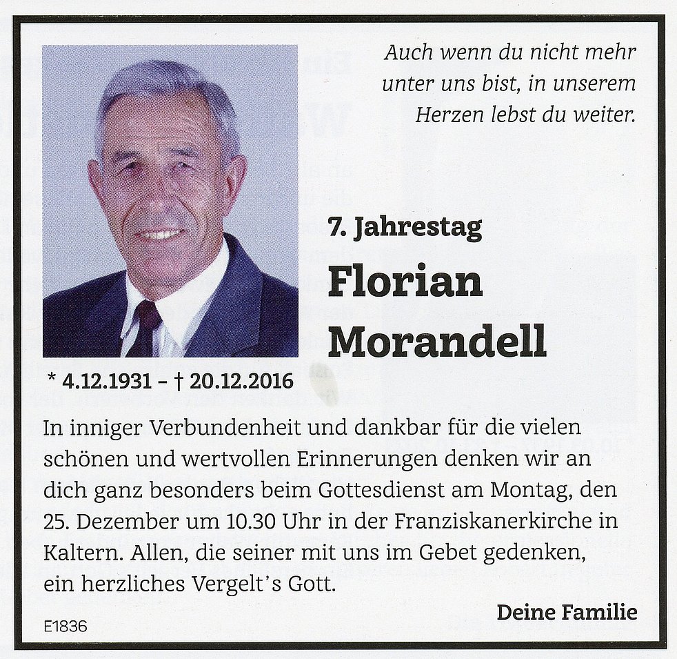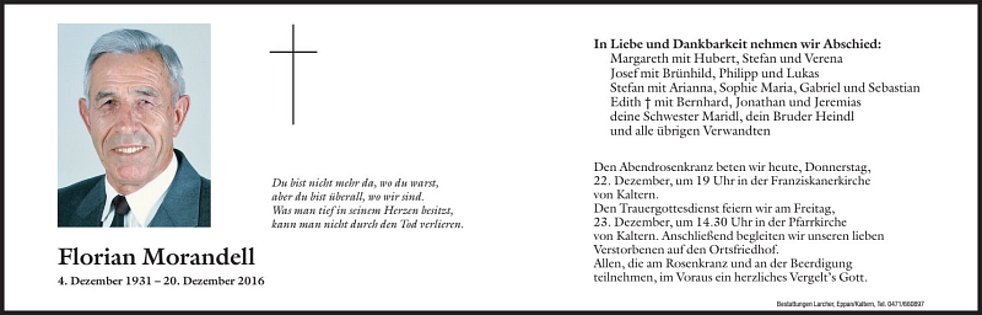 Den Trauergottesdienst feiern wir am Freitag, 23. Dezember 2016 um 14.30 Uhr in der Pfarrkirche von Kaltern. Anschließend begleiten wir unseren lieben Verstorbenen auf den Ortsfriedhof.