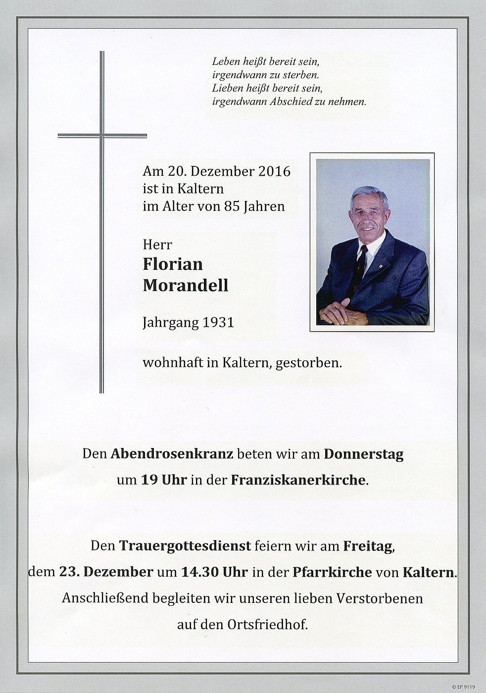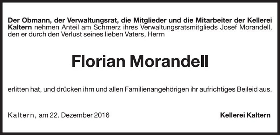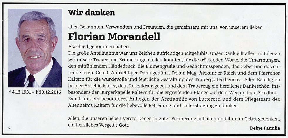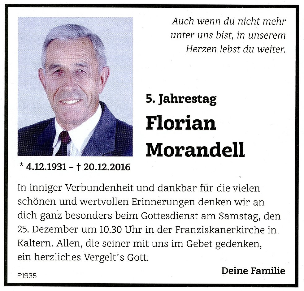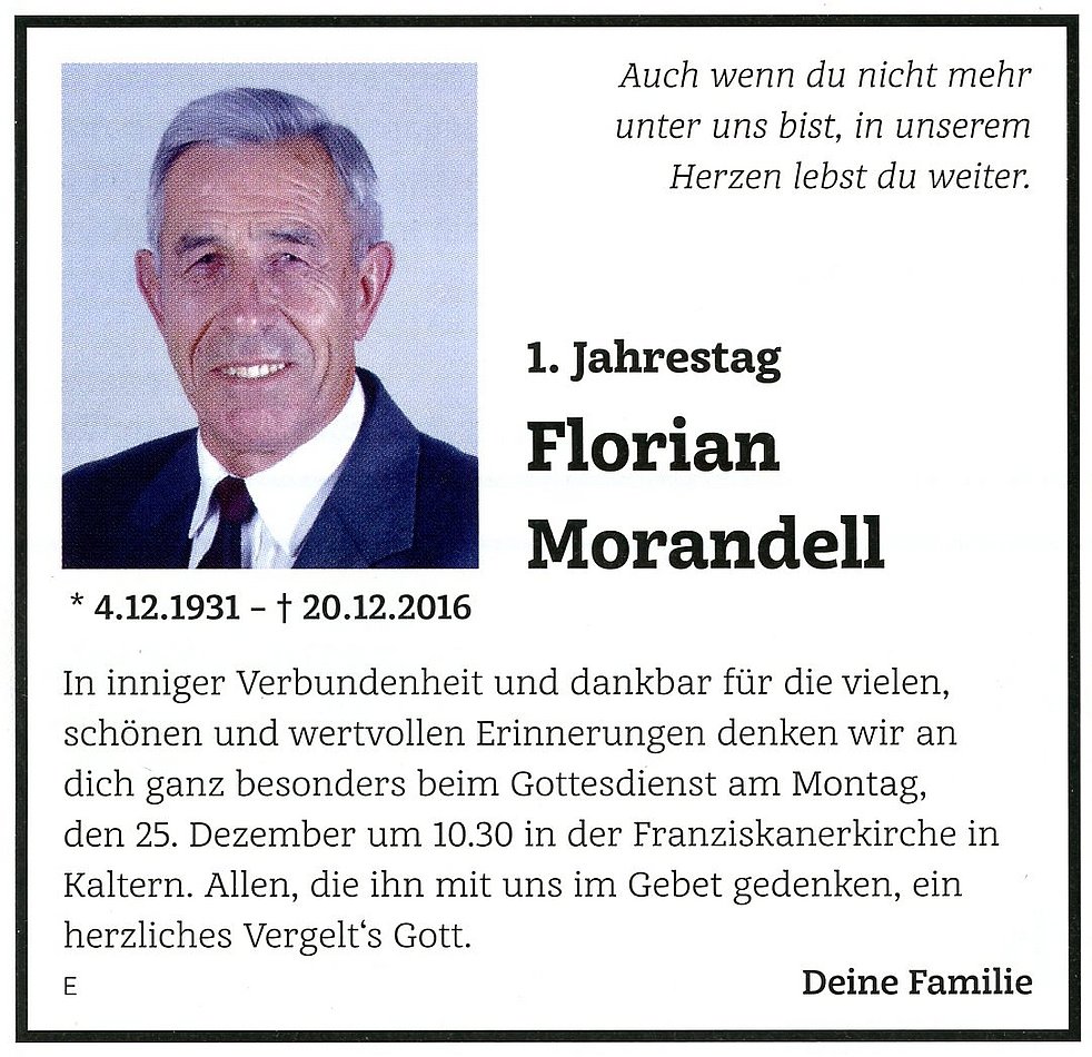 Den Trauergottesdienst feiern wir am Freitag, 23. Dezember 2016 um 14.30 Uhr in der Pfarrkirche von Kaltern. Anschließend begleiten wir unseren lieben Verstorbenen auf den Ortsfriedhof.