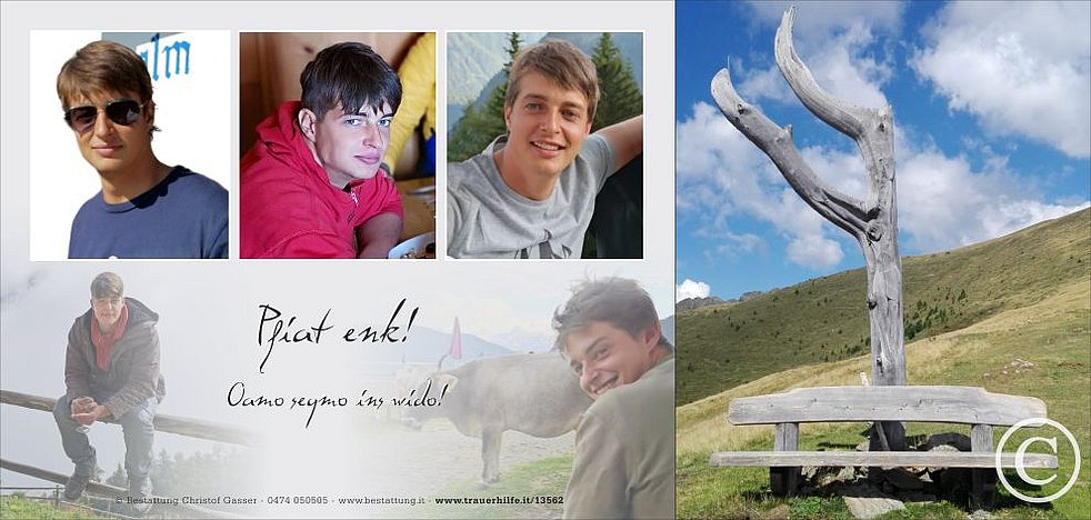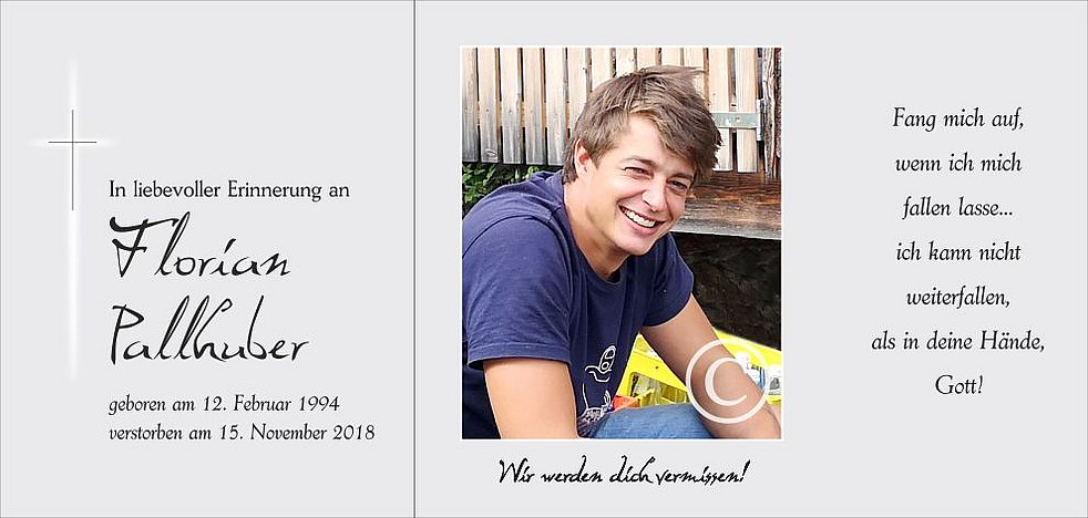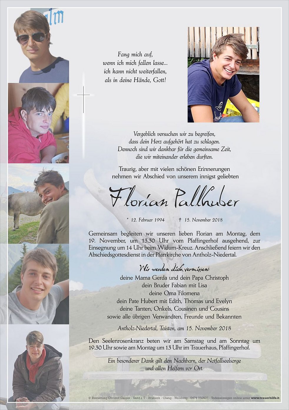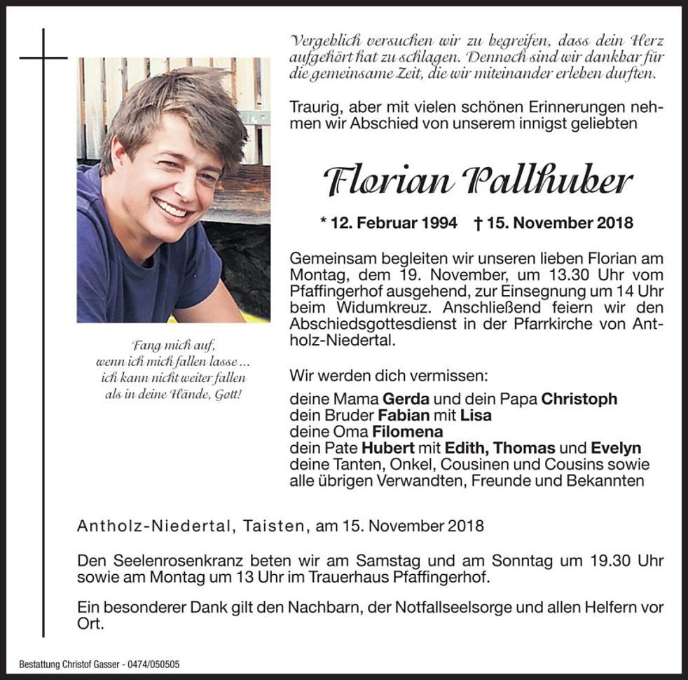 Gemeinsam begleiten wir unseren lieben Florian am Montag, dem 19. November, um 13.30 Uhr vom Pfaffingerhof ausgehend, zur Einsegnung um 14 Uhr beim Widum-Kreuz. Anschließend feiern wir den Abschiedsgottesdienst in der Pfarrkirche von Antholz-Niedertal.