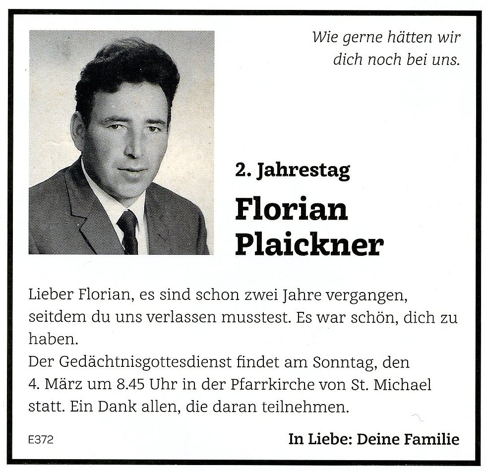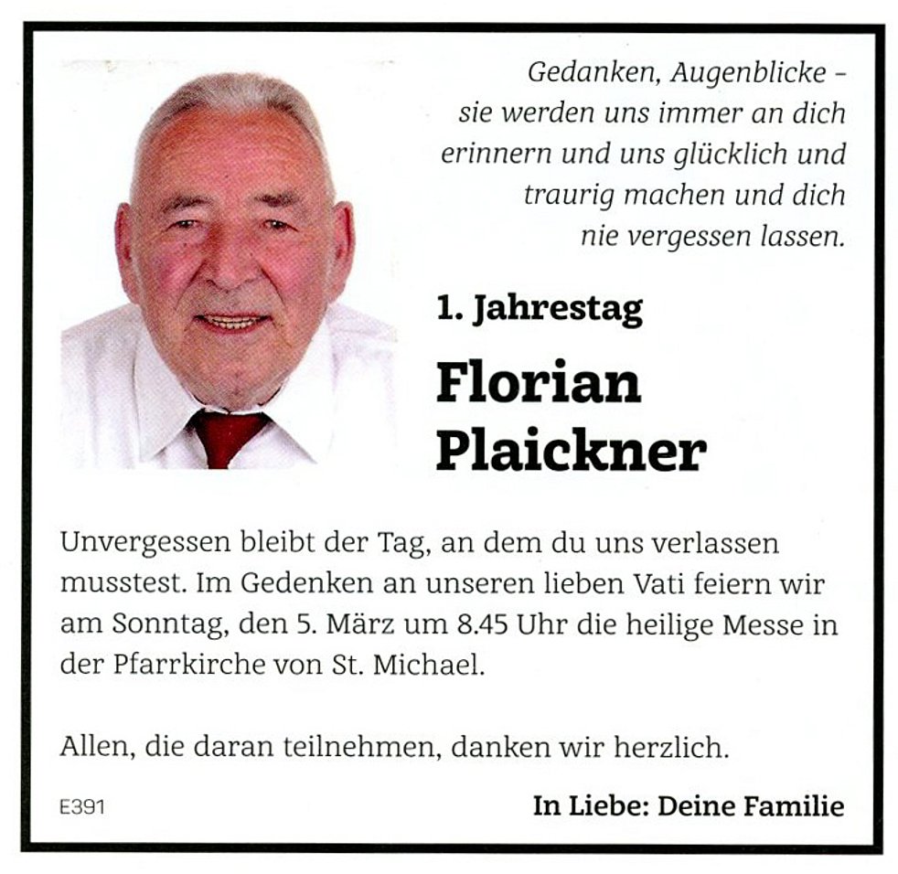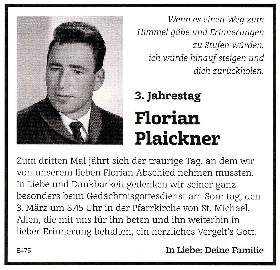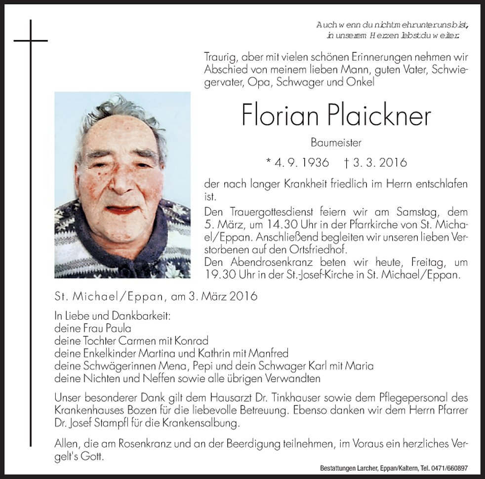 Den Trauergottesdienst feiern wir am Samstag, den 5. März, um 14.30 Uhr in der Pfarrkirche von St. Michael/Eppan. Anschließend begleiten wir unseren lieben Verstorbenen auf den Ortsfriedhof.