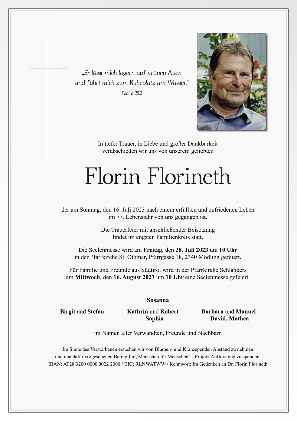 Wir waren viele Jahre Nachbarn und haben Florin als netten und stets hilfsbereiten Menschen gekannt und werden ihn immer in guter Erinnerung behalten!!!
