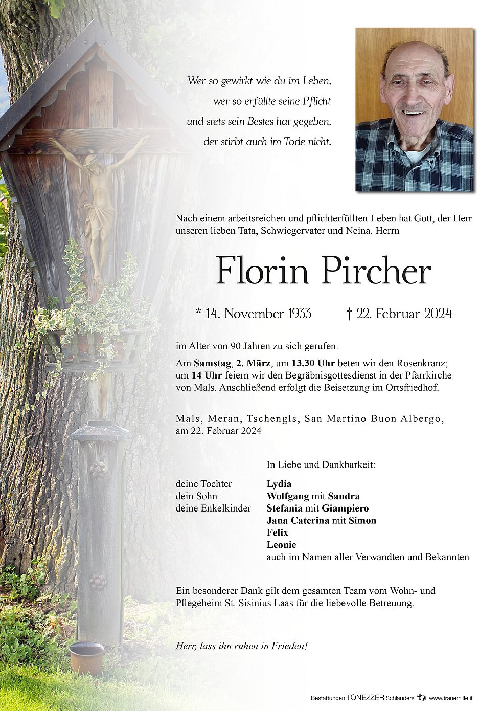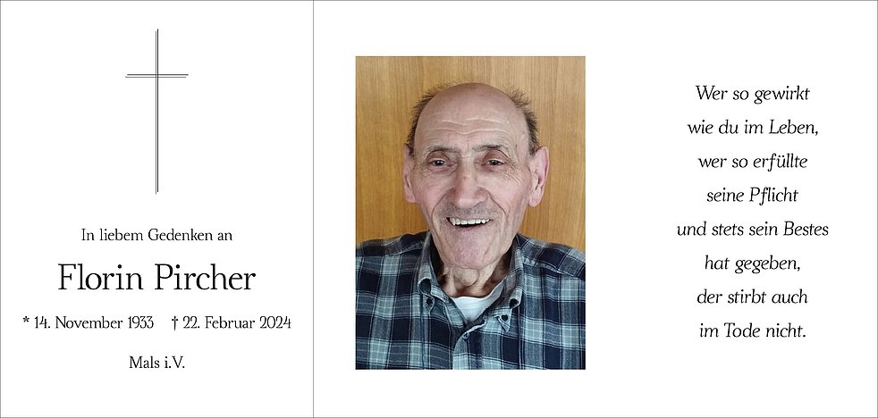 Am Samstag, 2. März, um 13.30 Uhr beten wir den Rosenkranz; um 14 Uhr feiern wir den Begräbnisgottesdienst in der Pfarrkirche von Mals. Anschließend erfolgt die Beisetzung im Ortsfriedhof.
