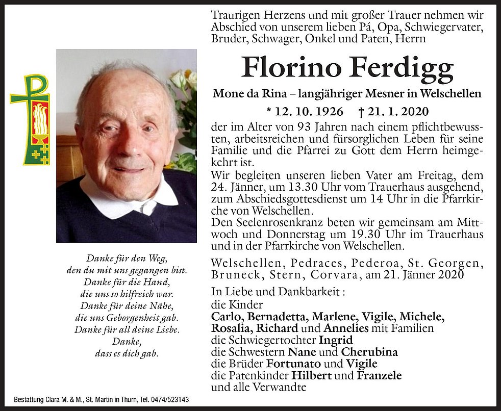 Ein besondere Dank, gilt dem Dr. Aldo Marcocci, den Krankenschwestern und dem Pflegepersonal des Sanitätssprengels, dem gesamten Personal des Wohn- und Seniorenheimes St. Martin in Thurn mit Dr. Eduard Agreiter für die liebevolle Pflege und Begleitung.