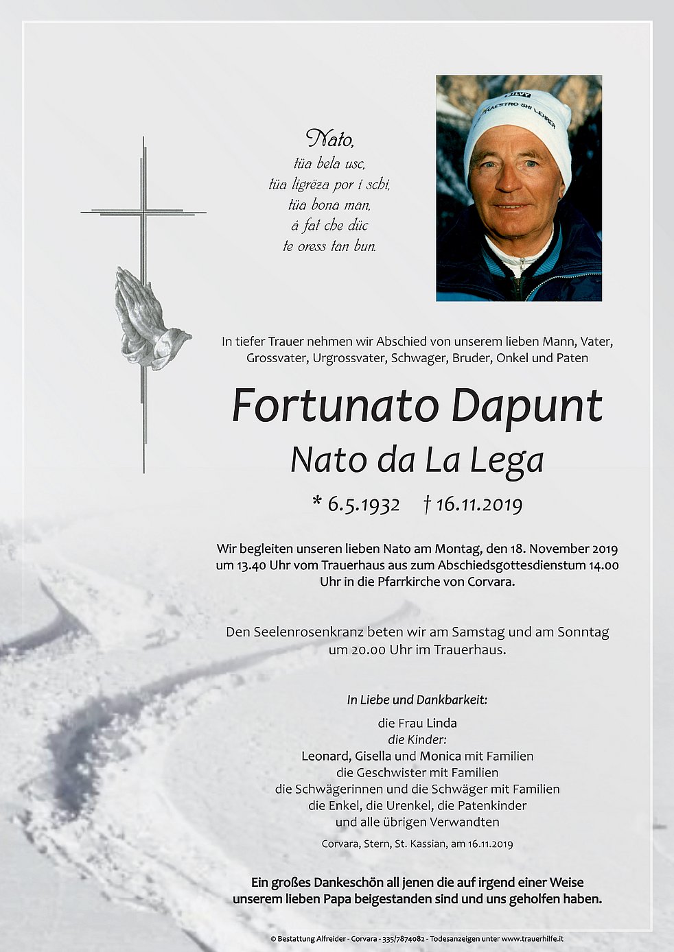 Wir begleiten unseren lieben Nato am Montag, den 18. November 2019 um 13.40 Uhr vom Trauerhaus aus zum Abschiedsgottesdienstum 14.00 Uhr in die Pfarrkirche von Corvara.