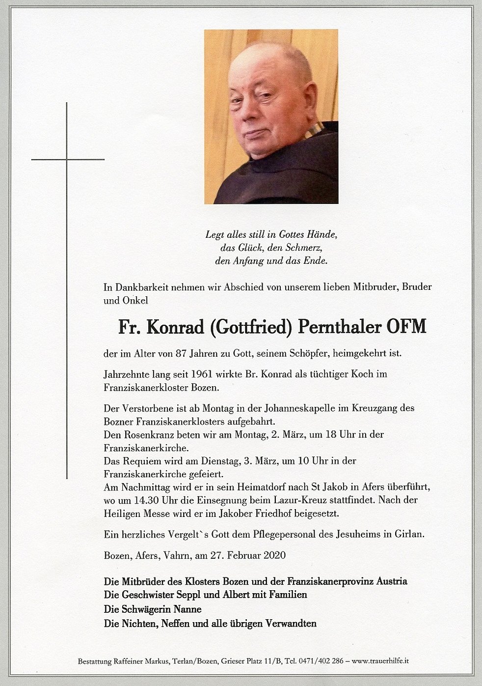 Der Verstorbene ist ab Montag in der Johanneskapelle im Kreuzgang des Bozner Franziskanerklosters aufgebahrt.