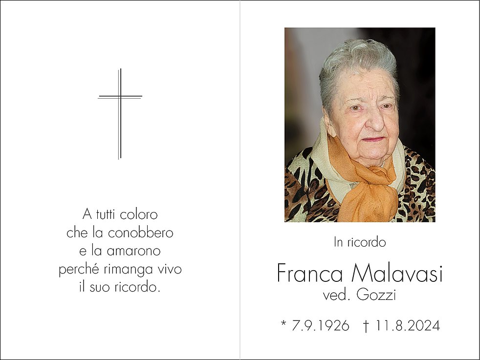 La S. Messa in suffragio verrà celebrata lunedì 19 agosto alle ore 9.30 nella chiesa Regina Pacis in via Dalmazia a Bolzano con successiva sepoltura alle ore 10.30 nella tomba di famiglia al cimitero di Oltrisarco.