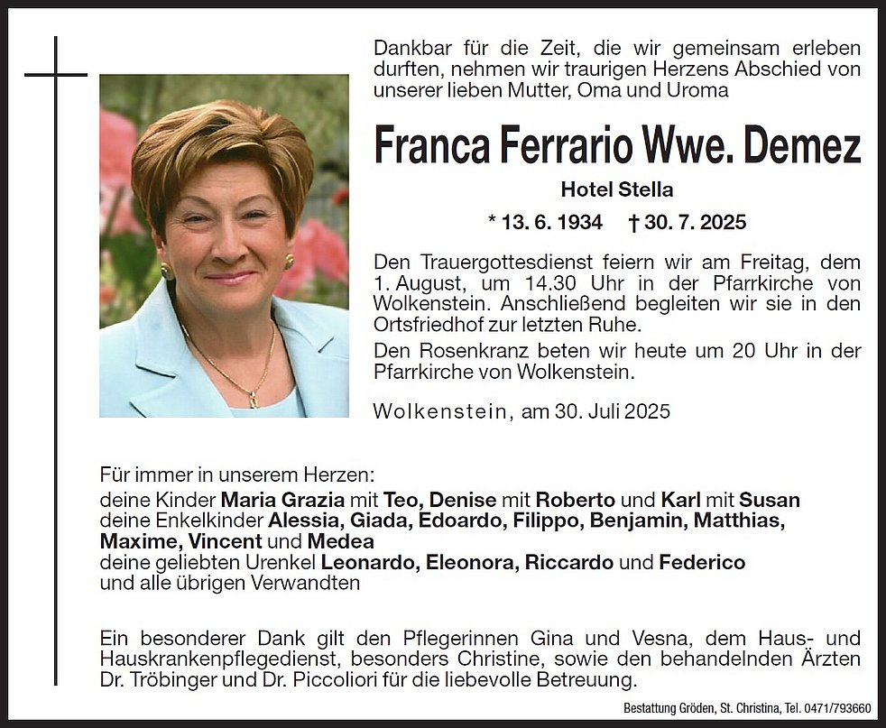 Den Trauergottesdienst feiern wir am Freitag, dem 01. August, um 14.30 Uhr in der Pfarrkirche von Wolkenstein. Anschließend begleiten wir sie in den Ortsfriedhof zur letzten Ruhe.