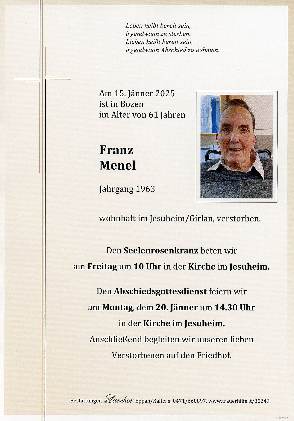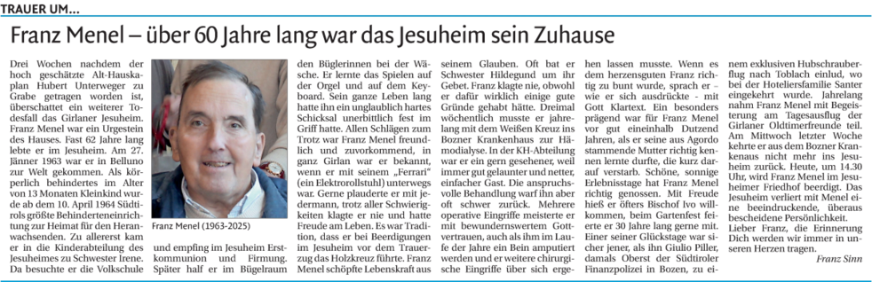 La S. Messa in suffragio verrà celebrata lunedì, 20 gennaio alle ore 14.30 nella Chiesa della Casa di Riposo “Jesuheim” a Cornaiano, con successivo corteo al cimitero.