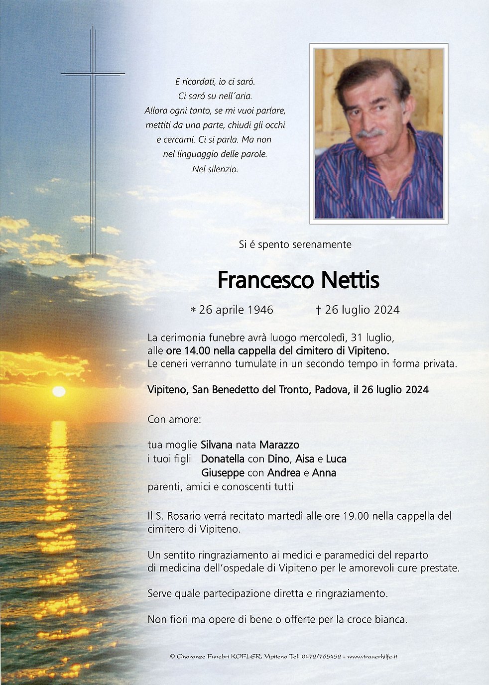 Die Trauerfeier findet am Mittwoch, 31. Juli, um 14.00 Uhr in der Friedhofskapele von Sterzing statt.