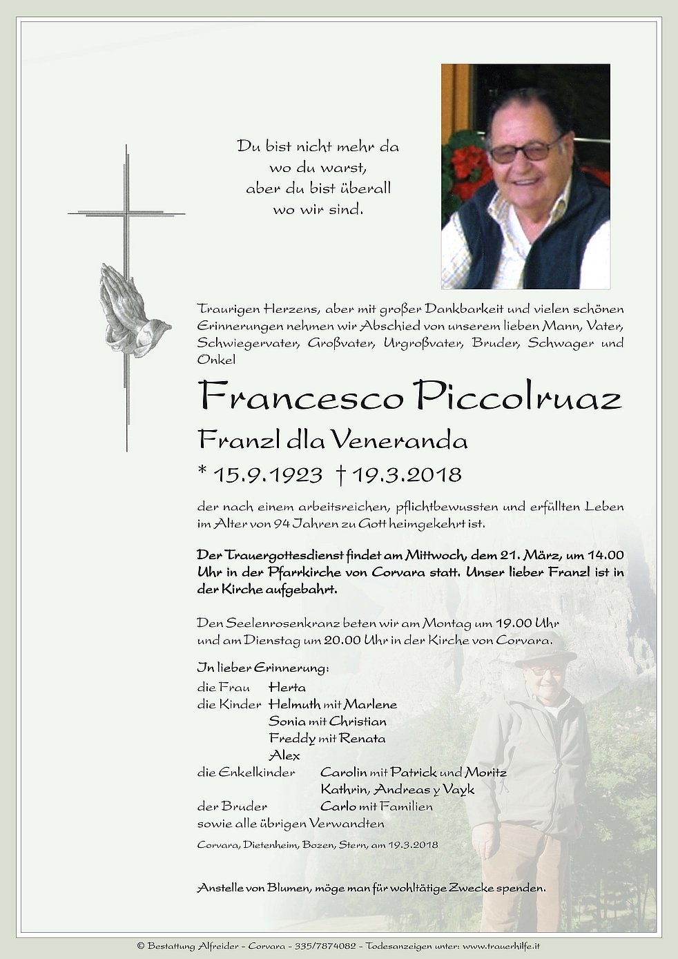 Der Trauergottesdienst findet am Mittwoch, dem 21. März, um 14.00 Uhr in der Pfarrkirche von Corvara statt. Unser lieber Franzl ist in der Kirche aufgebahrt.