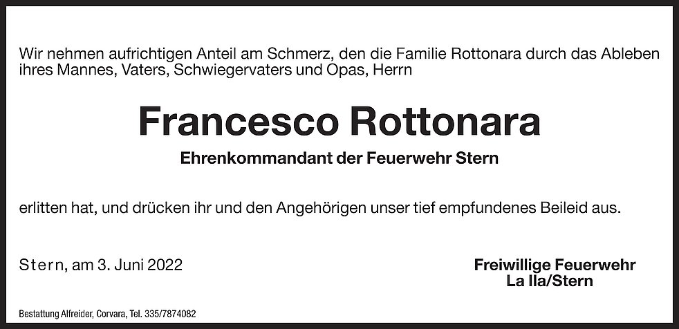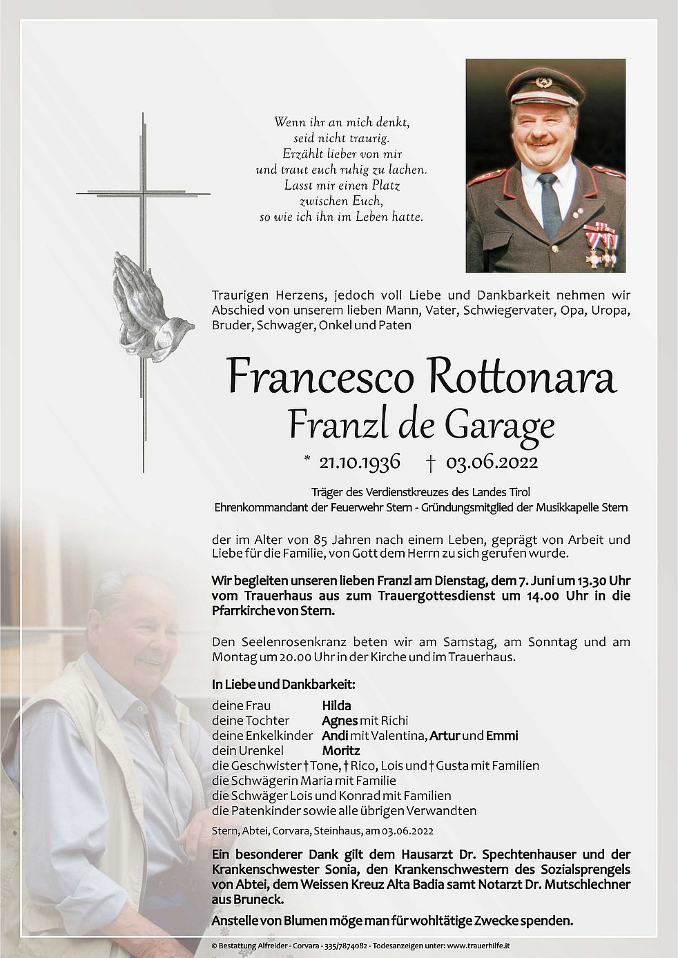 Wir begleiten unseren lieben Franzl am Dienstag, dem 7. Juni um 13.30 Uhr vom Trauerhaus aus zum Trauergottesdienst um 14.00 Uhr in die Pfarrkirche von Stern.