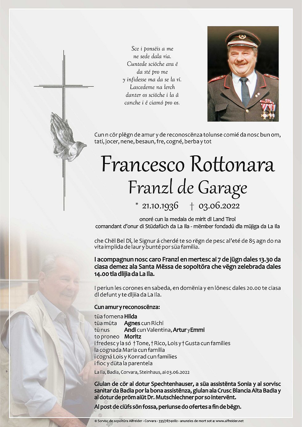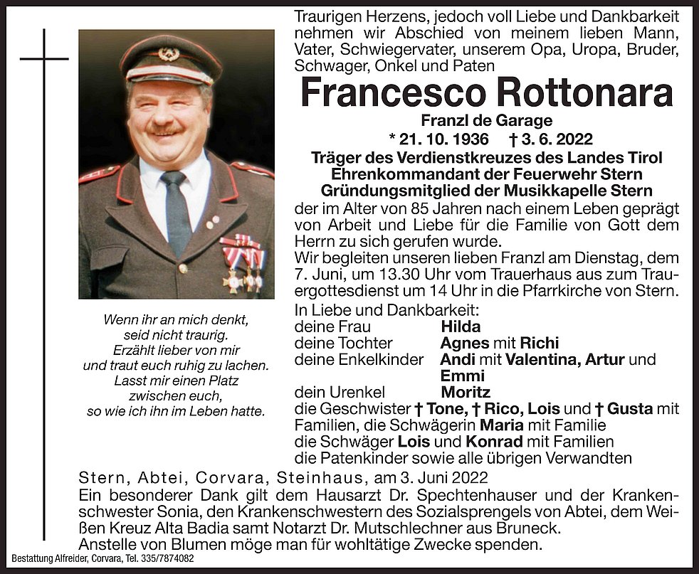 Ein besonderer Dank gilt dem Hausarzt Dr. Spechtenhauser und der Krankenschwester Sonia, den Krankenschwestern des Sozialsprengels von Abtei, dem Weissen Kreuz Alta Badia samt Notarzt Dr. Mutschlechner aus Bruneck.