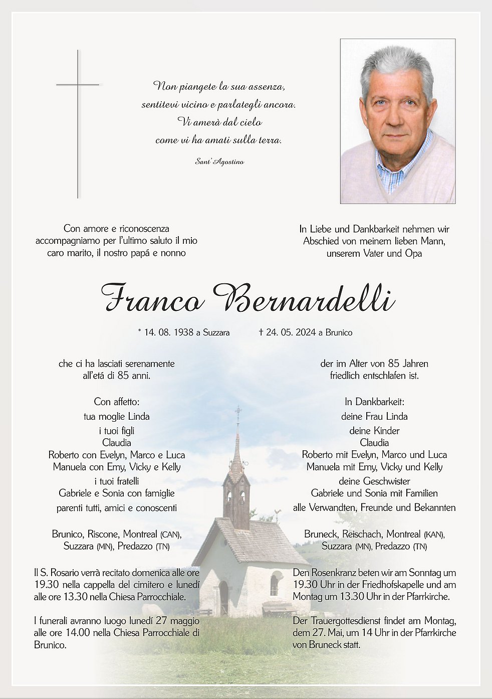 I funerali avranno luogo lunedí 27 maggio alle ore 14.00 nella Chiesa Parrocchiale di Brunico.