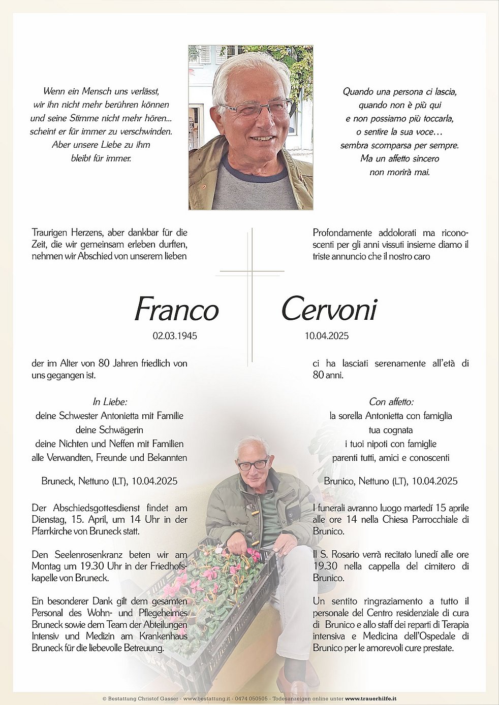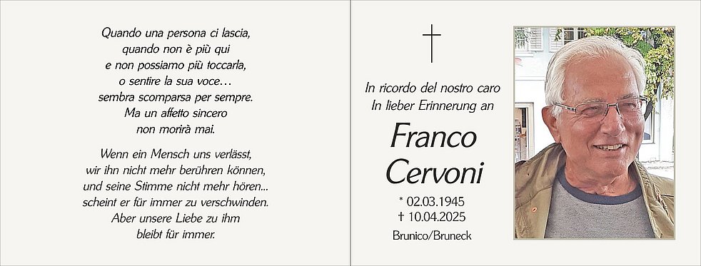 Der Abschiedsgottesdienst findet am Dienstag, 15. April, um 14 Uhr in der Pfarrkirche von Bruneck statt.