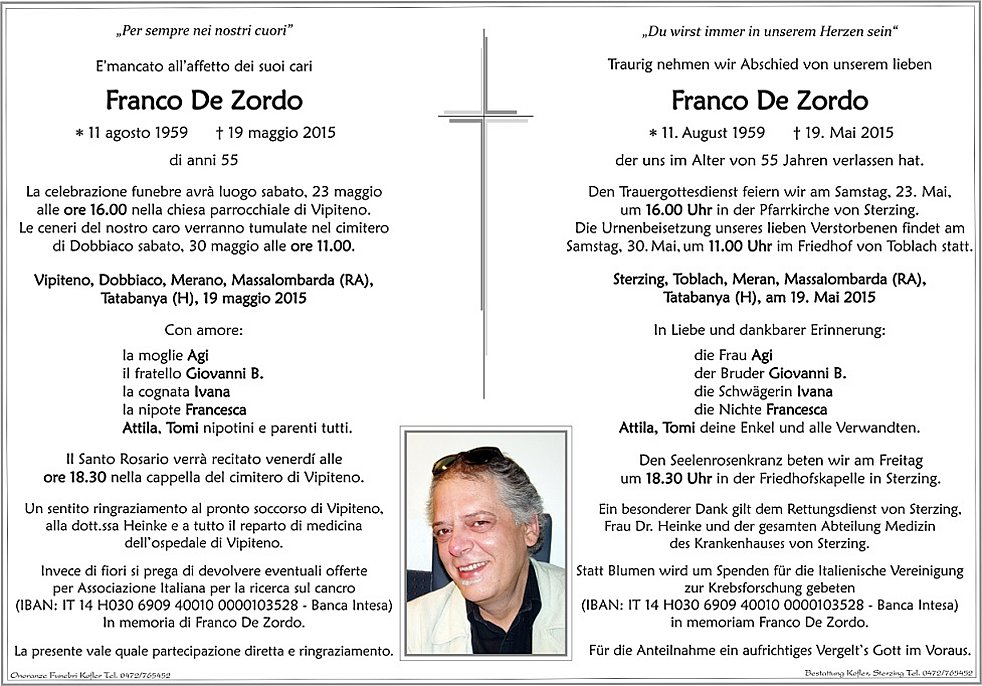 Statt Blumen wird um Spenden für die Italienische Vereinigung zur Krebsforschung gebeten (IBAN: IT 14 H030 6909 40010 0000103528 - Banca Intesa)