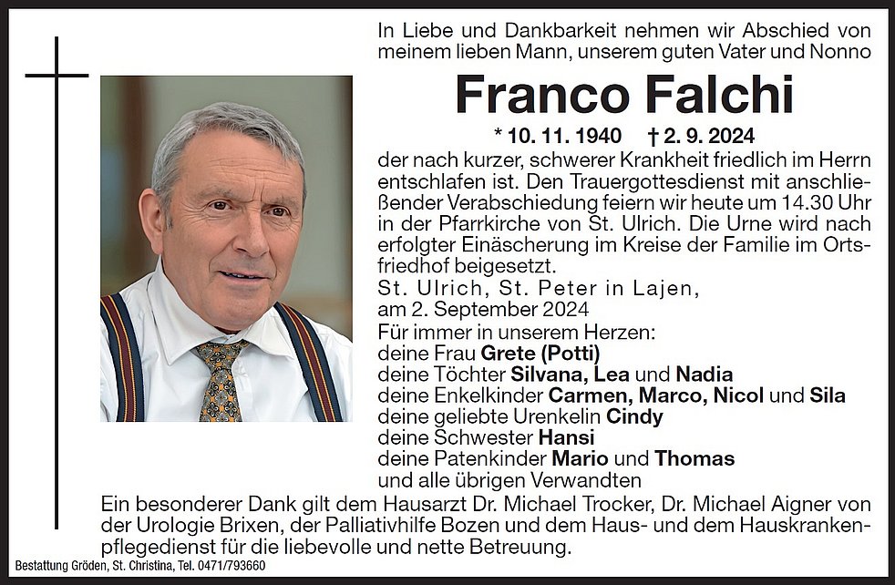 Den Trauergottesdienst mit anschließender Verabschiedung feiern wir am Mittwoch, dem 04. September, um 14.30 Uhr in der Pfarrkirche von St. Ulrich. Die Urne wird nach erfolgter Einäscherung im Kreise der Familie im Ortsfriedhof beigesetzt.