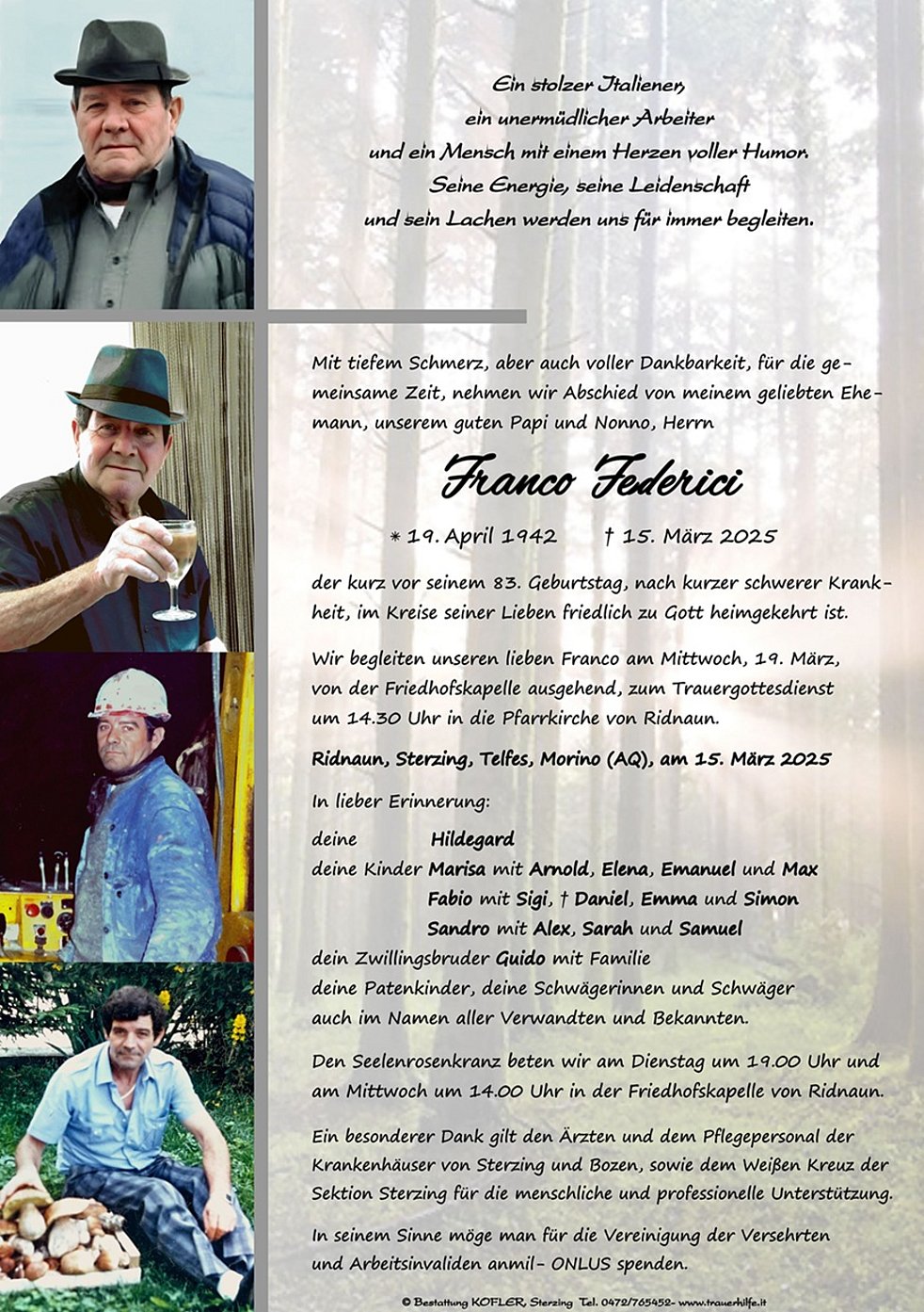 Wir begleiten unseren lieben Franco am Mittwoch, 19. März, von der Friedhofskapelle ausgehend, zum Trauergottesdienst um 14.30 Uhr in die Pfarrkirche von Ridnaun.