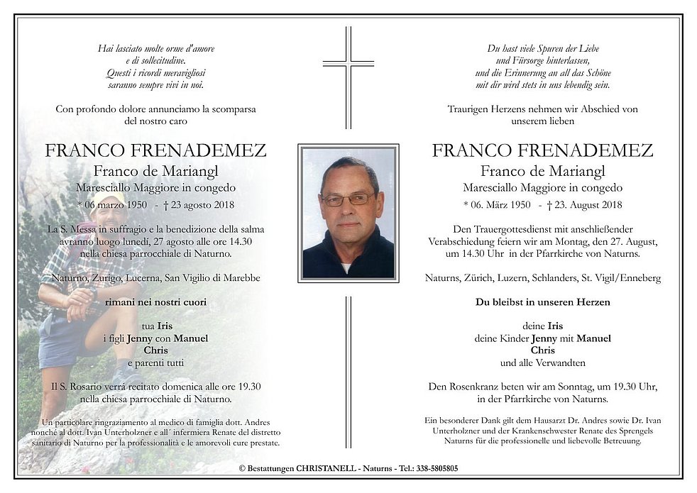 Den Trauergottesdienst mit anschließender Verabschiedung feiern wir am Montag, den 27. August, um 14.30 Uhr in der Pfarrkirche von Naturns.