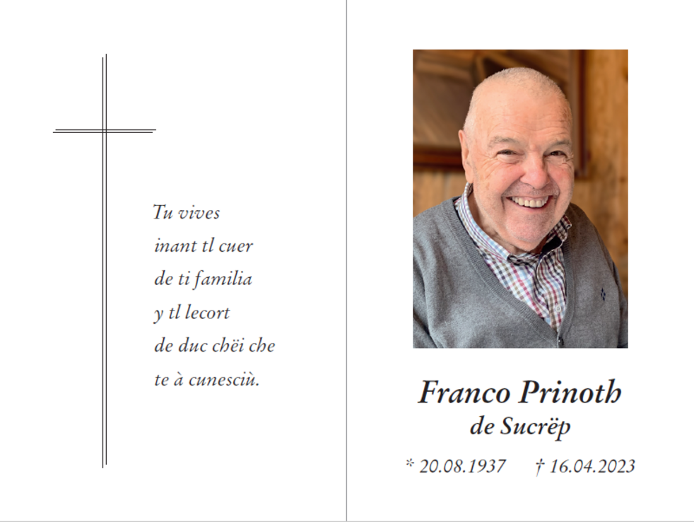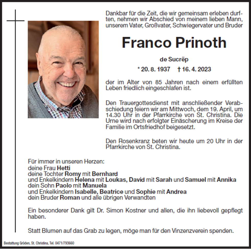 Den Trauergottesdienst mit anschließender Verabschiedung feiern wir am Mittwoch, dem 19. April, um 14.30 Uhr in der Pfarrkirche von St. Christina. Die Urne wird nach erfolgter Einäscherung im Kreise der Familie im Ortsfriedhof beigesetzt.