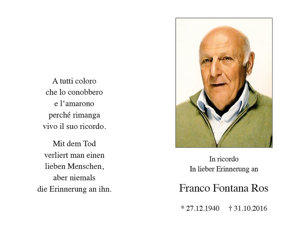 Lo comunicano con grande dolore, ad esequie avvenute come da espressa volontà del defunto, la moglie Gaby, i figli Massimo con Francesca e Dani con Sabine e Marlies, gli amati nipoti Beatrice, Alessandro e Leonardo, la sorella Dora, i fratelli Lionello con Monique, Marco e Susan, Ivo con Roswitha e parenti tutti.