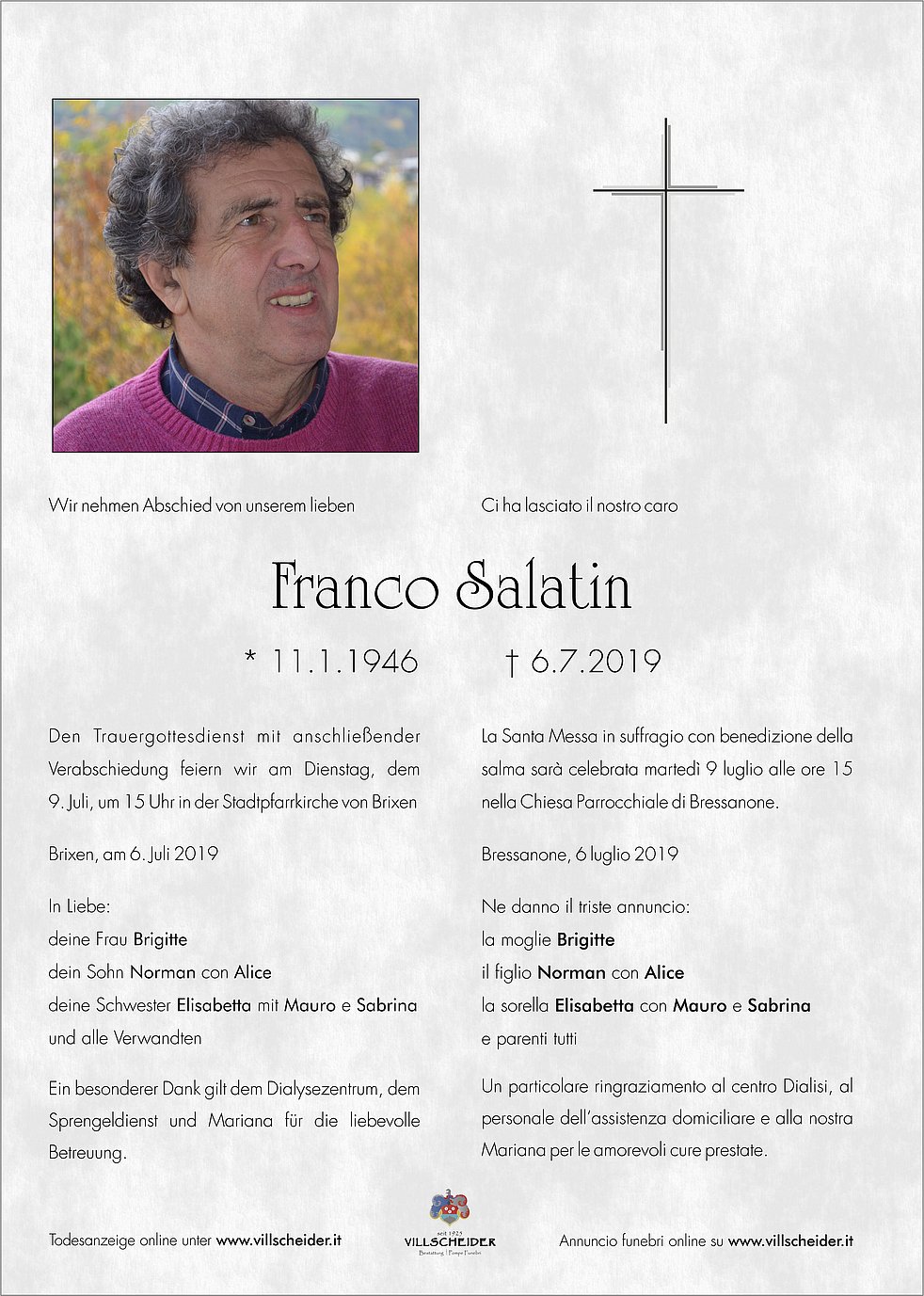 Franco hat das menschliche Stadtbild von Brixen mitgeprägt, wie er mit dem Fahrrad durch die Stadtgassen gefahren ist, immer freundlich, immer neugierig, immer teilnehmend. So bleibt er in Erinnerung. Mein Beileid, liebe Brigitte! Alles Gute für dich!