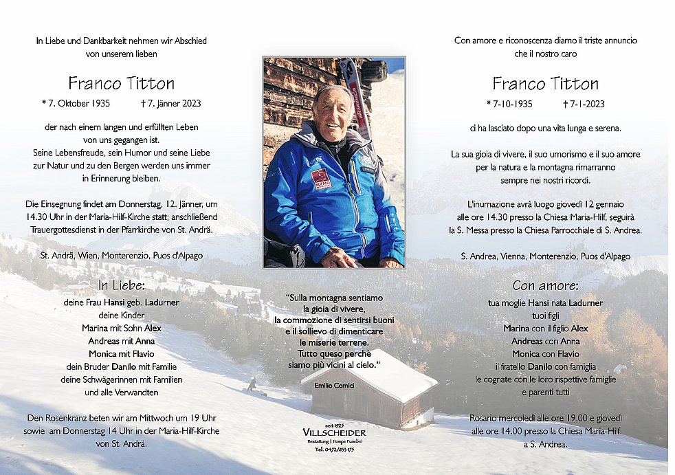Mit traurigem Herzen nehmen wir Abschied von unserem Gründungsmitglied, langjährigem Skilehrer und guten Freund Franco Titton.