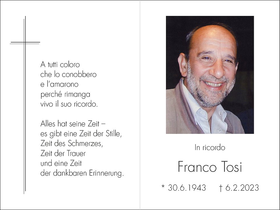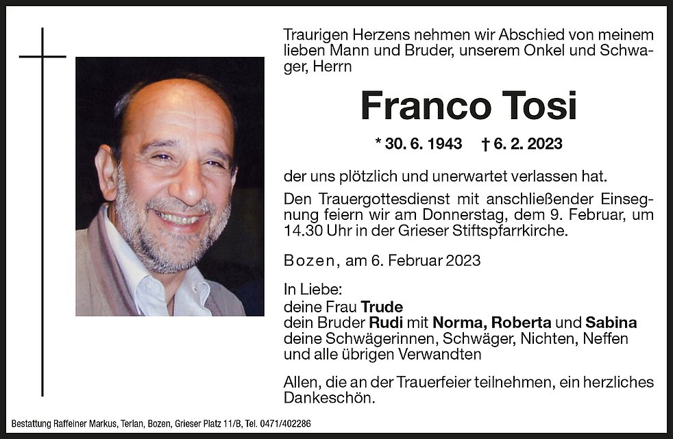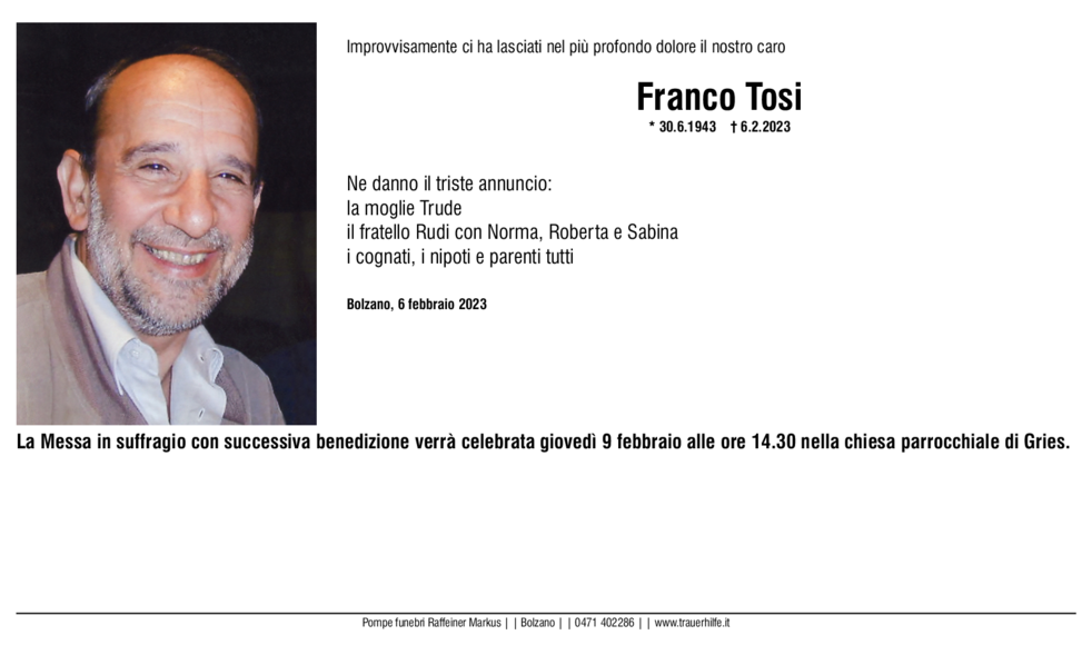 La Messa in suffragio con successiva benedizione verrà celebrata giovedì 9 febbraio alle ore 14.30 nella chiesa parrocchiale di Gries.