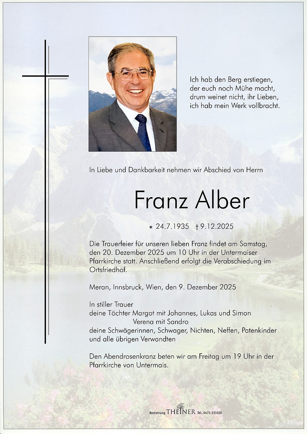 Die Trauerfeier für unseren lieben Franz findet am Samstag, den 20. Dezember 2025 um 10 Uhr in der Untermaiser Pfarrkirche statt. Anschließend erfolgt die Verabschiedung im Ortsfriedhof.