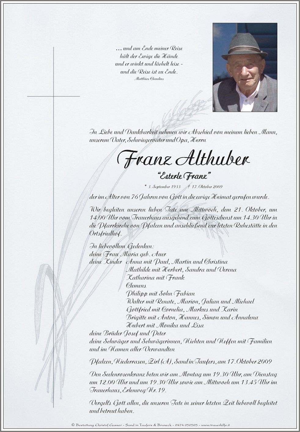 14.00 Uhr vom Trauerhaus ausgehend zum Gottesdienst um 14.30 Uhr in die Pfarrkirche von Pfalzen und anschließend zur letzten Ruhestätte in den Ortsfriedhof.
