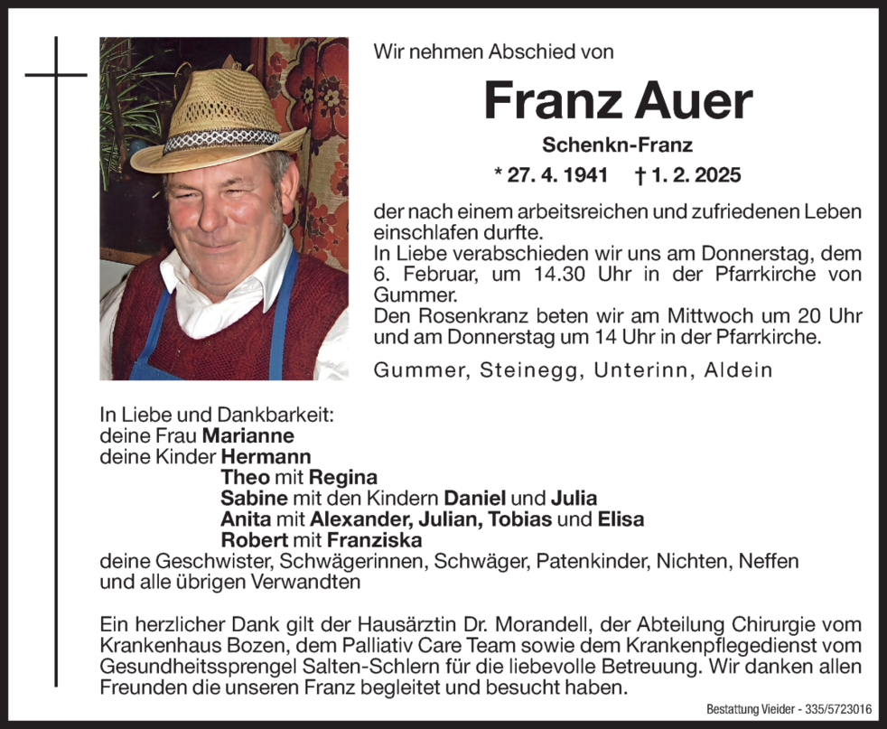 Ein herzlicher Dank gilt der Hausärztin Dr. Morandell, der Abteilung Chirurgie vom Krankenhaus Bozen, dem Palliativ Care Team sowie dem Krankenpflegedienst vom Gesundheitssprengel Salten-Schlern für die liebevolle Betreuung. Wir danken allen Freunden die unseren Franz begleitet und besucht haben.