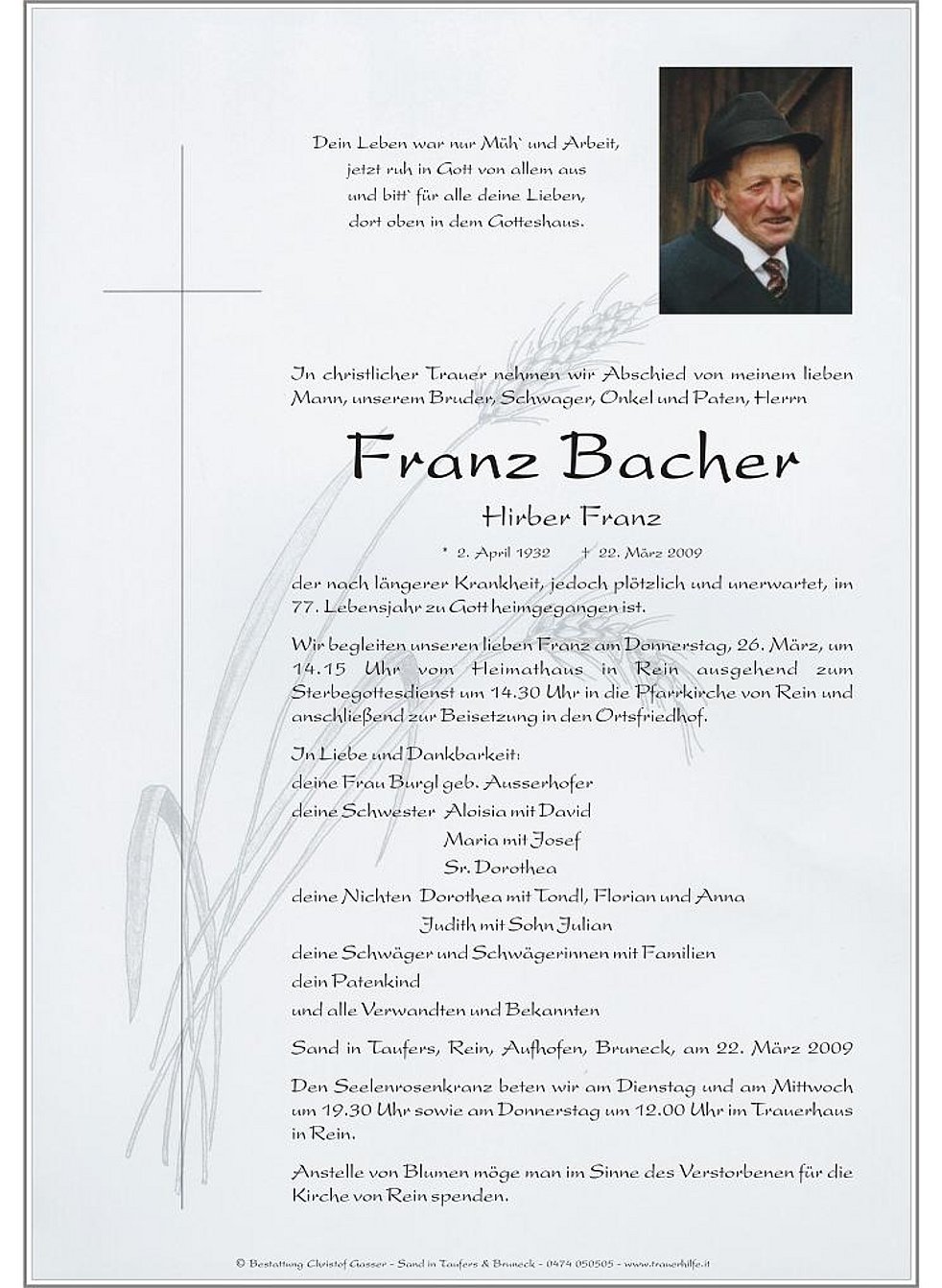 Wir begleiten unseren lieben Franz am Donnerstag, 26. März, um 14.15 Uhr vom Heimathaus in Rein ausgehend zum Sterbegottesdienst um 14.30 Uhr in die Pfarrkirche von Rein und anschließend zur Beisetzung in den Ortsfriedhof.
