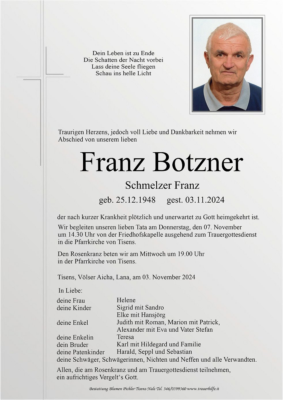 Begräbnisgottesdienst: 07.11. - 14:30 Uhr Pfarrkirche Tisens
