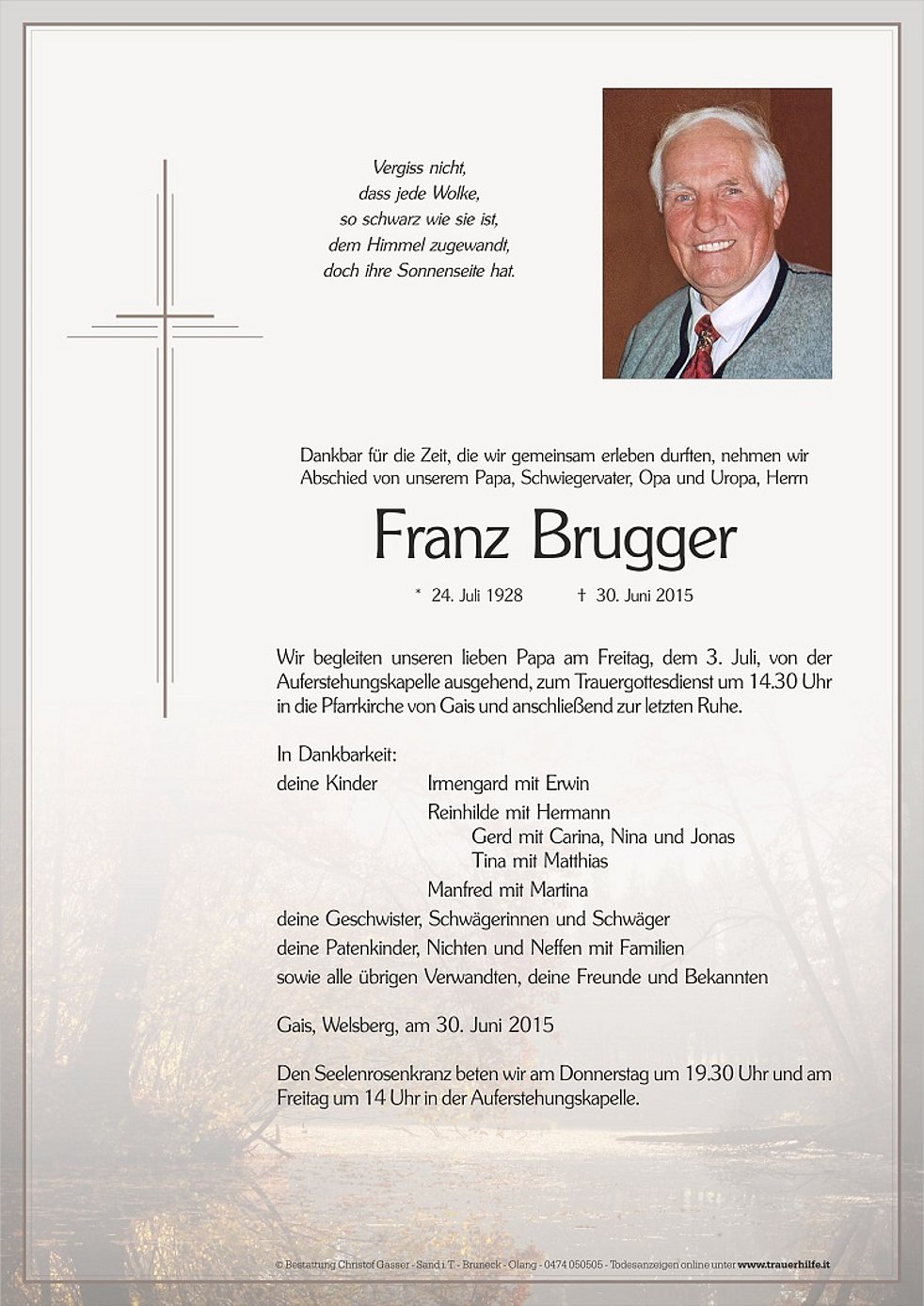 Wir begleiten unseren lieben Papa am Freitag, dem 3. Juli, von der Auferstehungskapelle ausgehend, zum Trauergottesdienst um 14.30 Uhr in die Pfarrkirche von Gais und anschließend zur letzten Ruhe.