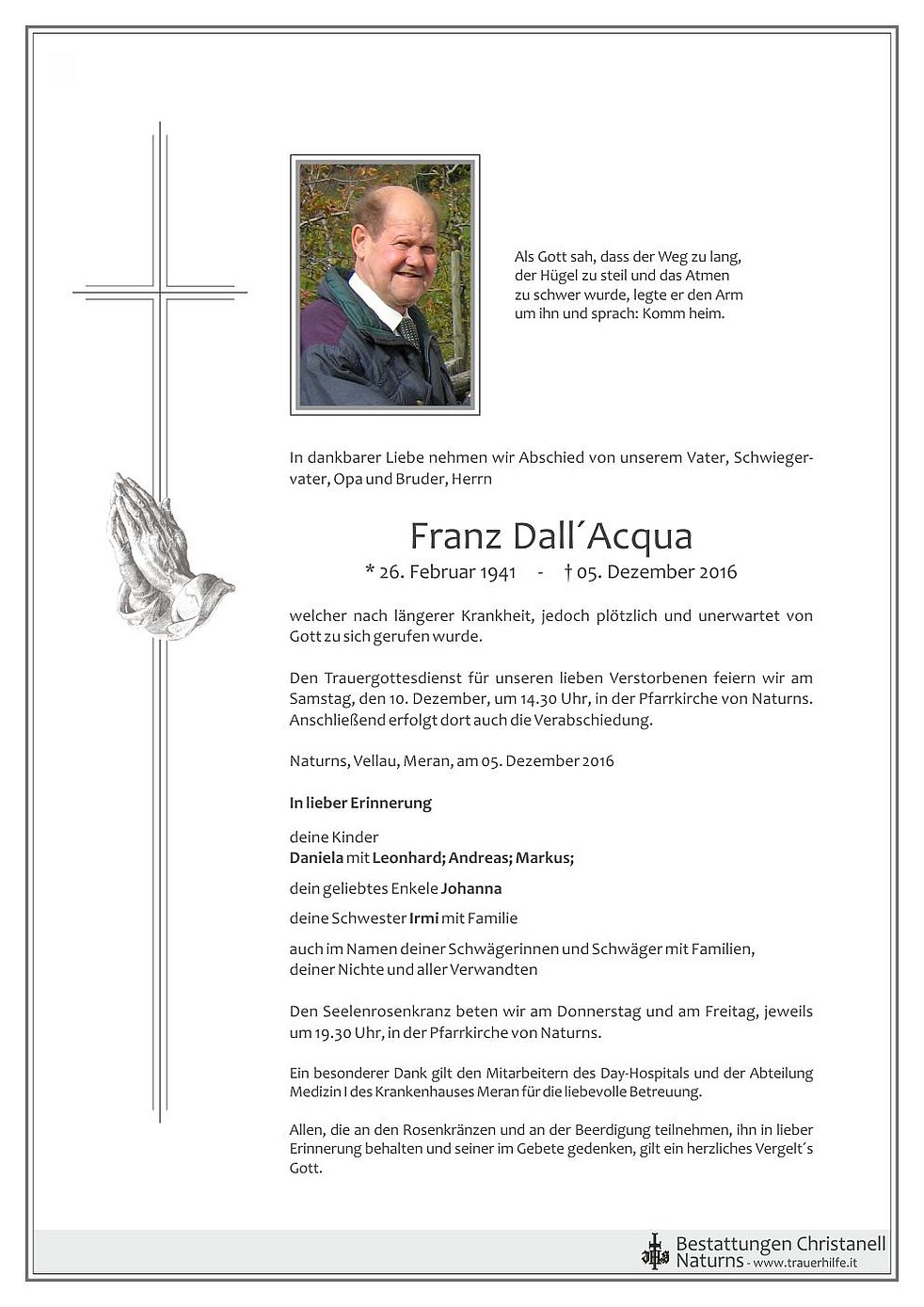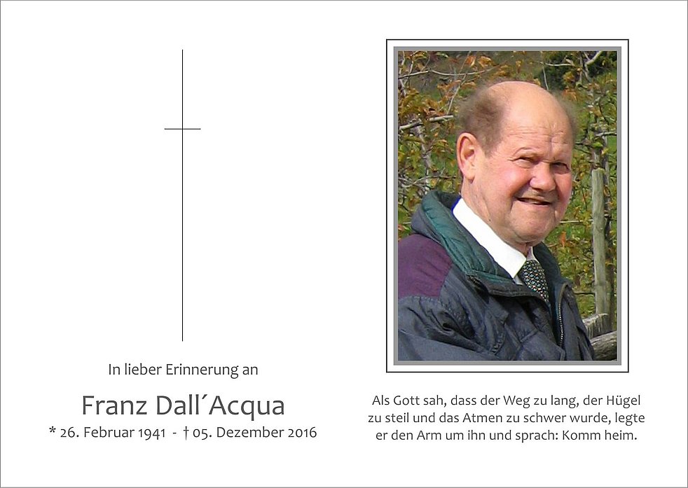 Den Trauergottesdienst für unseren lieben Verstorbenen feiern wir am Samstag, den 10. Dezember, um 14.30 Uhr, in der Pfarrkirche von Naturns. Anschließend erfolgt dort auch die Verabschiedung.