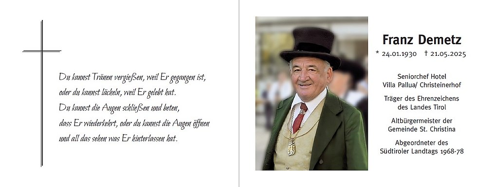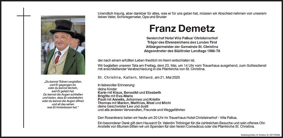 Anstelle von Blumen bitten wir um Spenden für den Verein Comedicus oder die Pfarrkirche St. Christina.