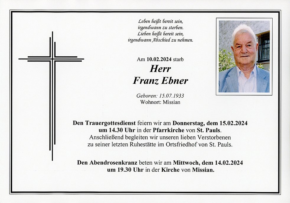 Den Trauergottesdienst feiern wir am Donnerstag, dem 15. Februar, um 14.30 Uhr in der Pfarrkirche von St. Pauls. Anschließend begleiten wir unseren lieben Verstorbenen auf den Ortsfriedhof.