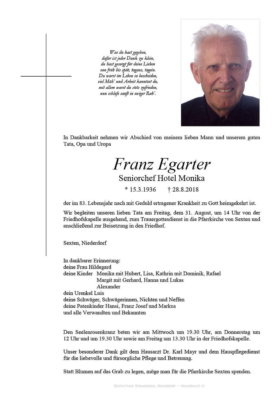 Wir begleiten unseren lieben Tata am Freitag, dem 31. August, um 14 Uhr von der Friedhofskapelle ausgehend, zum Trauergottesdienst in die Pfarrkirche von Sexten und anschließend zur Beisetzung in den Friedhof.