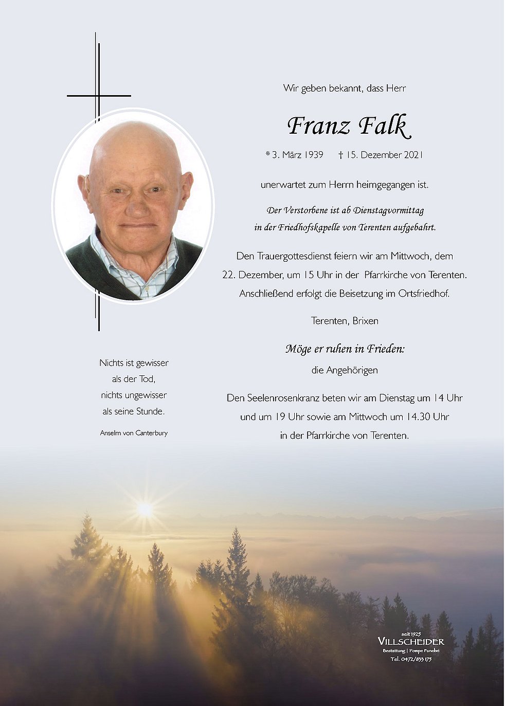 Begräbnisgottesdienst: 22.12. - 15:00 Uhr Terenten