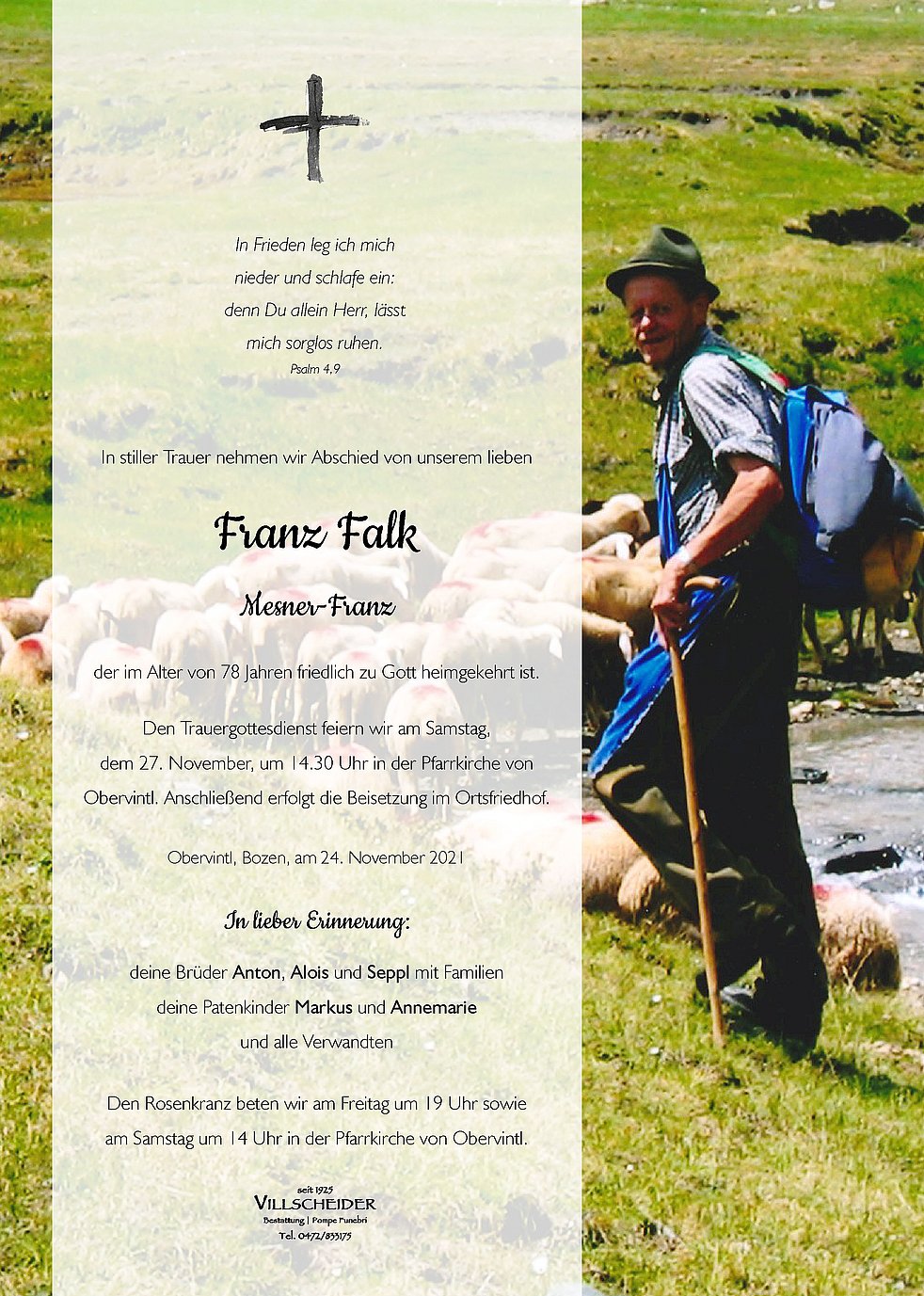 Lieber Franz du warst immer ein Zufriedener Mensch, hast im Dorf geholfen wo es brauchte, warst in der Kirche als Mesner tätig, warst immer ein Gönner des Kirchenchor, hast uns immer wieder mit einer Spende Unterstützt, Nun Ruhe in Gottes Frieden. Danke Danke.