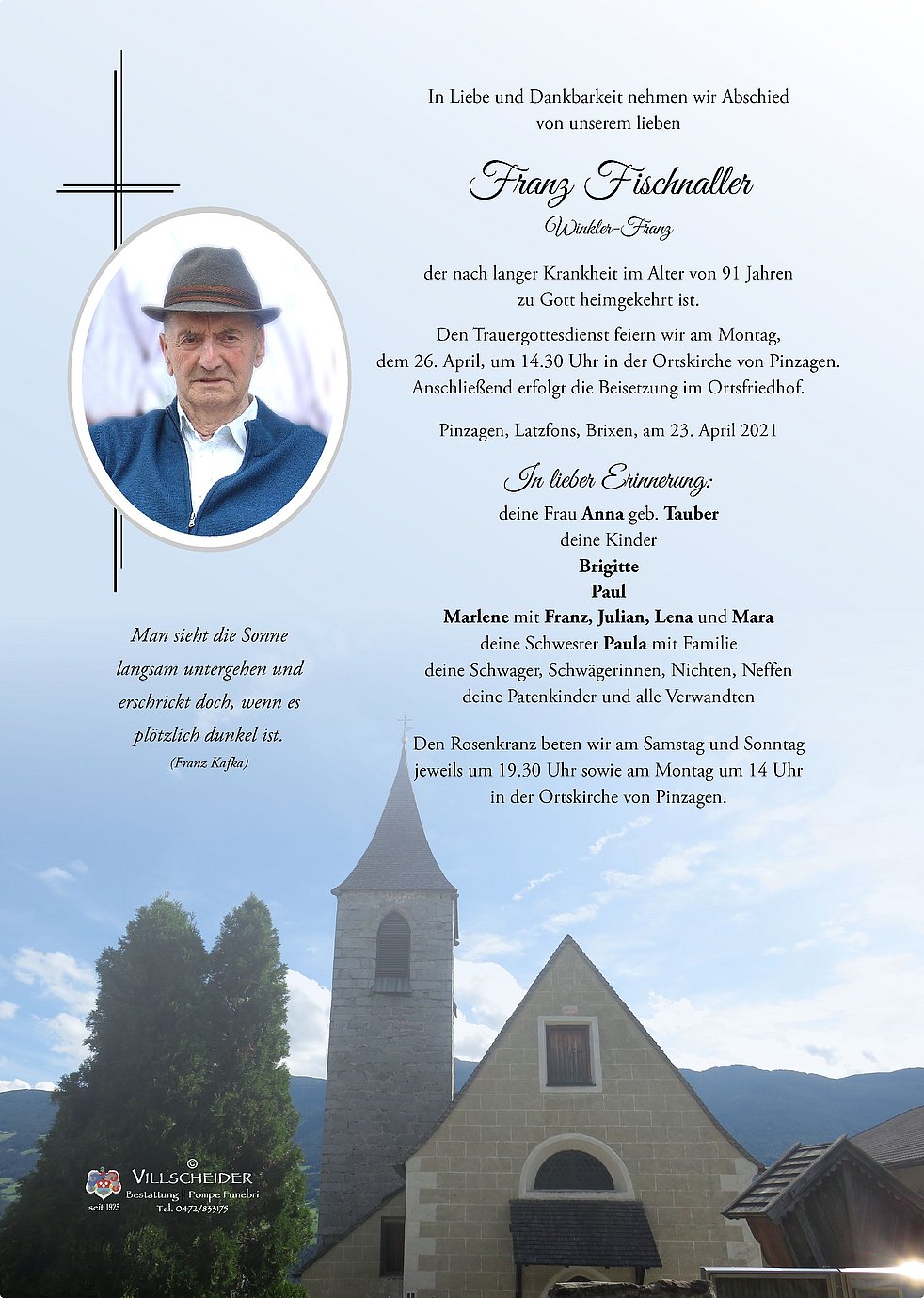 Liebe Nanne, Liebe Brigitte, Paul und Marlene! Lange hat Franz sein Leid ertragen und trotzdem schmerzt euch nun der Verlust Eures Mannes und Vaters.