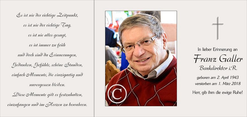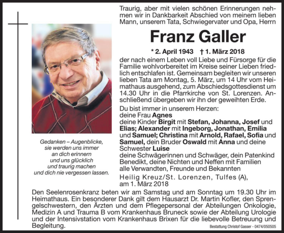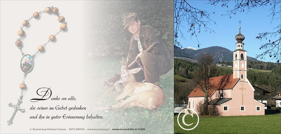 Anstelle von Blumen möge man im Sinne des Verstorbenen für Familien in Not oder der Südtiroler Krebshilfe spenden.