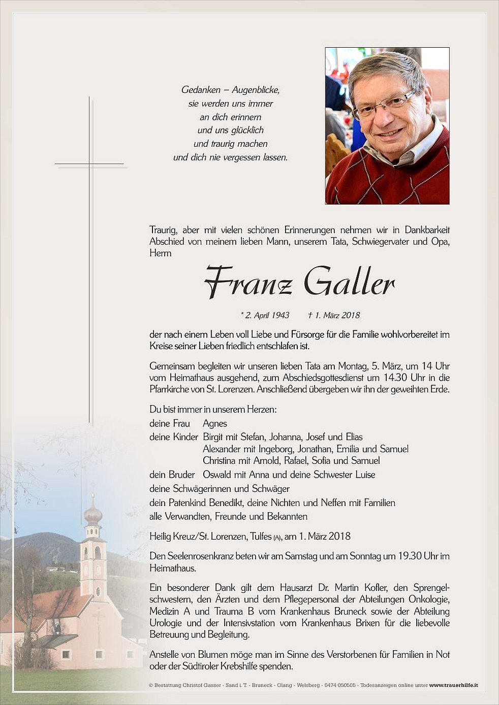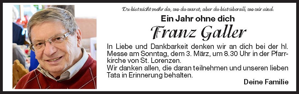 Gemeinsam begleiten wir unseren lieben Tata am Montag, 5. März, um 14 Uhr vom Heimathaus ausgehend, zum Abschiedsgottesdienst um 14.30 Uhr in die Pfarrkirche von St. Lorenzen. Anschließend übergeben wir ihn der geweihten Erde.