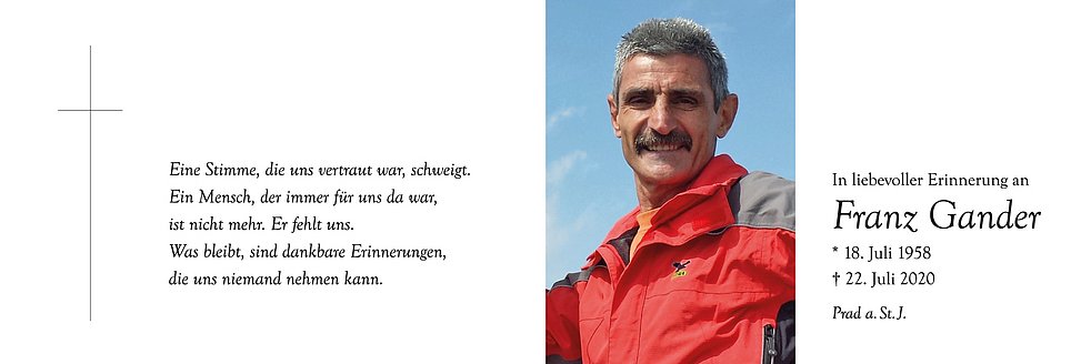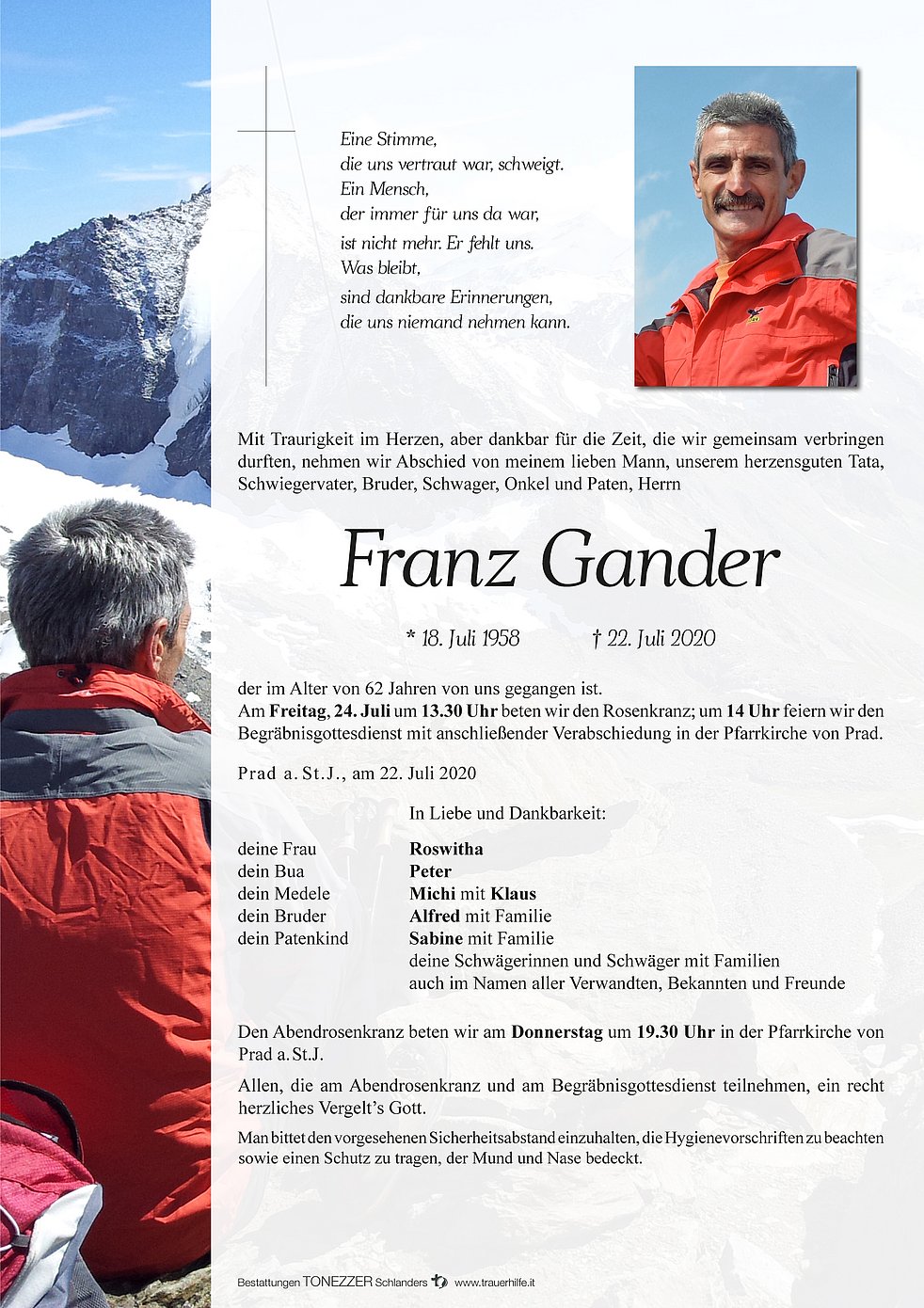 Am Freitag, 24. Juli um 13.30 Uhr beten wir den Rosenkranz; um 14 Uhr feiern wir den Begräbnisgottesdienst mit anschließender Verabschiedung in der Pfarrkirche von Prad.