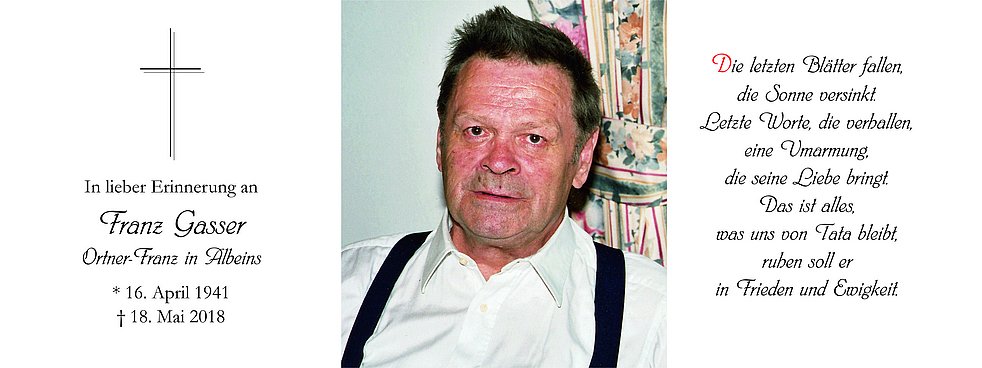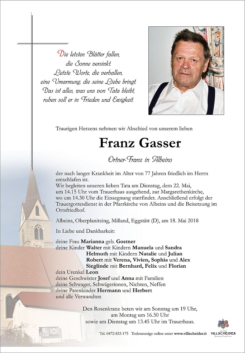 wo um 14.30 Uhr die Einsegnung stattfindet. Anschließend erfolgt der Trauergottesdienst in der Pfarrkirche von Albeins und die Beisetzung im Ortsfriedhof.